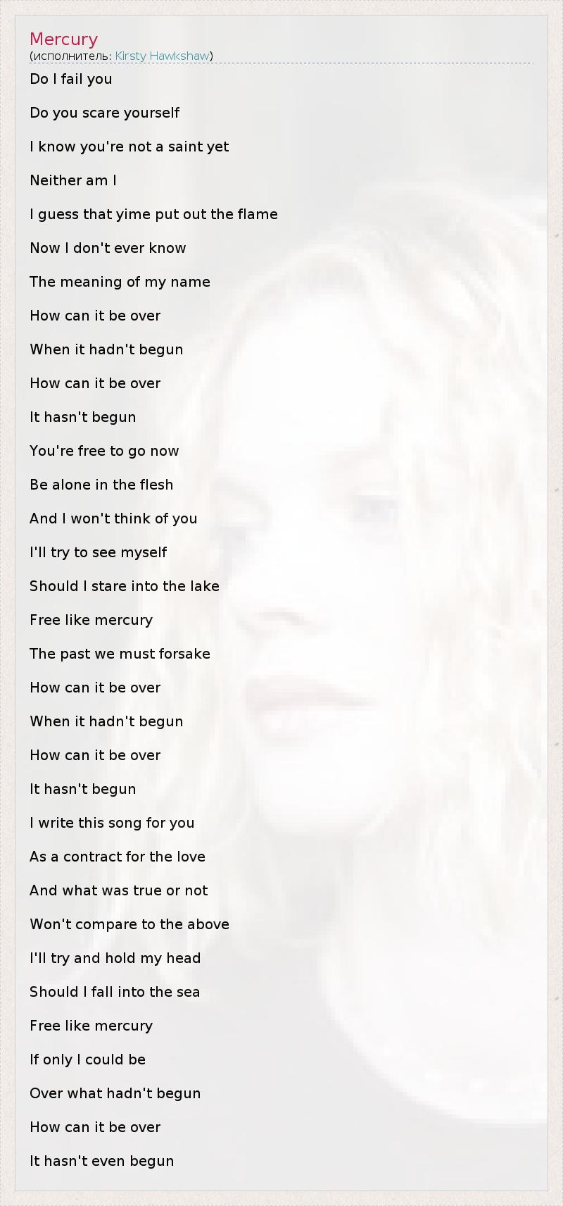 Do I fail you Do you scare yourself I know you're not a saint yet Neither am I I guess that yime put out the flame Now I don't ever know The meaning of my name How can it be over When it hadn't begun How can it be over It hasn't begun You're free to go now Be alone in the flesh And I won't think of you I'll try to see myself Should I stare into the lake Free like mercury The past we must forsake How can it be over When it hadn't begun How can it be over It hasn't begun I write this song for you As a contract for the love And what was true or not Won't compare to the above I'll try and hold my head Should I fall into the sea Free like mercury If only I could be Over what hadn't begun How can it be over It hasn't even begun
