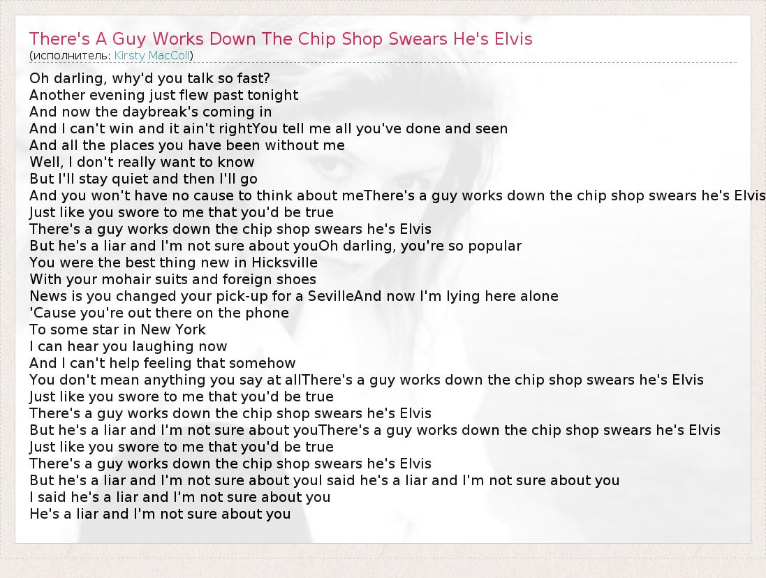 А как ты думаешь, о чем песня "There's A Guy Works Down The Chip Shop Swears He's Elvis" ?