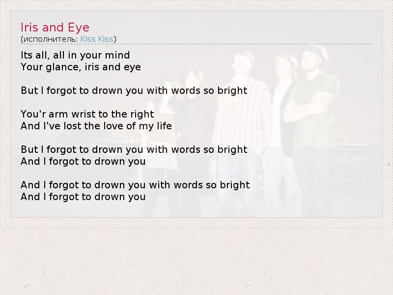 Its all, all in your mind Your glance, iris and eye But I forgot to drown you with words so bright You'r arm wrist to the right And I've lost the love of my life But I forgot to drown you with words so bright And I forgot to drown you And I forgot to drown you with words so bright And I forgot to drown you