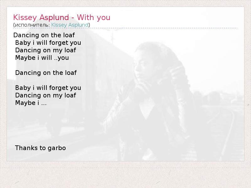 Dancing on the loaf Baby i will forget you Dancing on my loaf Maybe i will ..you Dancing on the loaf Baby i will forget you Dancing on my loaf Maybe i ... Thanks to garbo