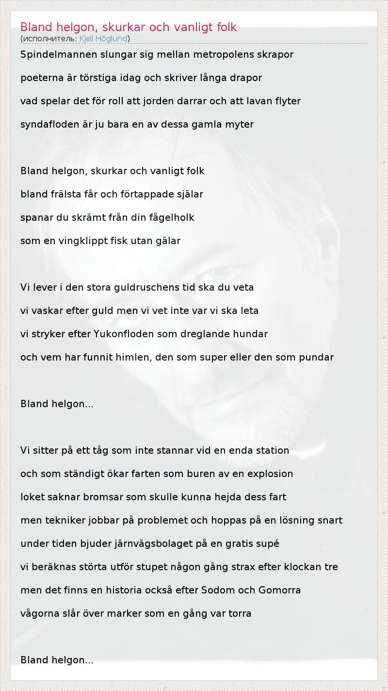 А как ты думаешь, о чем песня "Bland helgon, skurkar och vanligt folk" ?