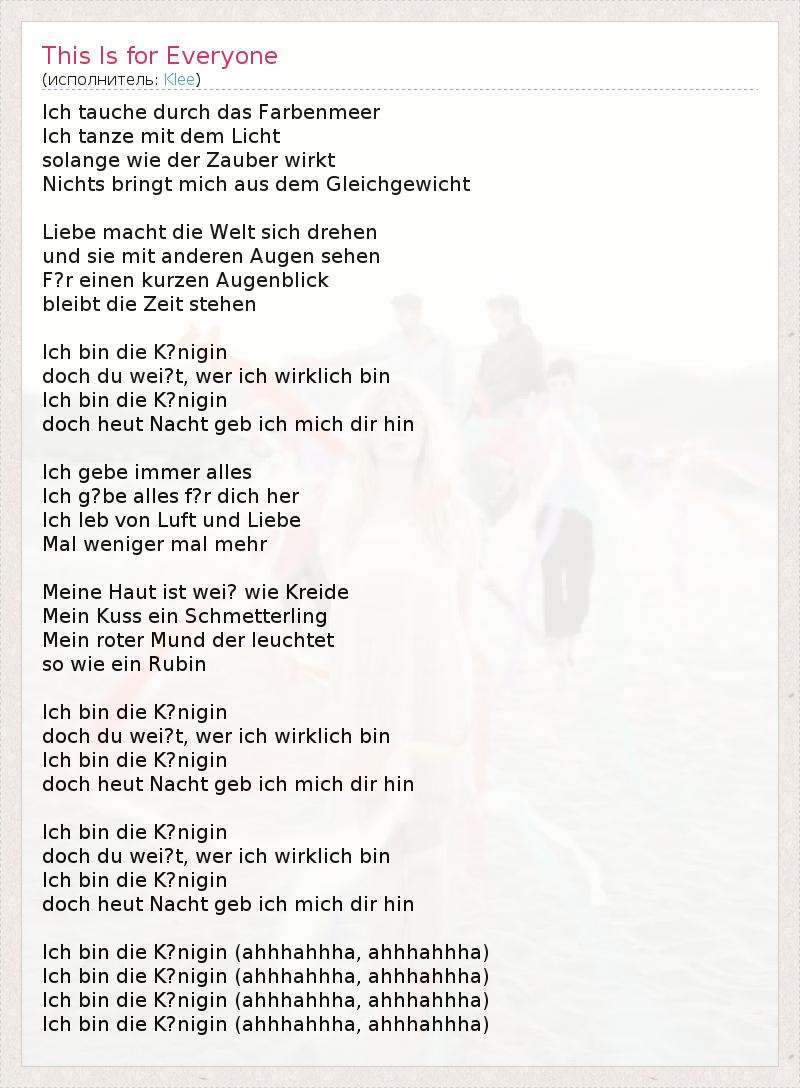 Ich tauche durch das Farbenmeer Ich tanze mit dem Licht solange wie der Zauber wirkt Nichts bringt mich aus dem Gleichgewicht Liebe macht die Welt sich drehen und sie mit anderen Augen sehen F?r einen kurzen Augenblick bleibt die Zeit stehen Ich bin die K?nigin doch du wei?t, wer ich wirklich bin Ich bin die K?nigin doch heut Nacht geb ich mich dir hin Ich gebe immer alles Ich g?be alles f?r dich her Ich leb von Luft und Liebe Mal weniger mal mehr Meine Haut ist wei? wie Kreide Mein Kuss ein Schmetterling Mein roter Mund der leuchtet so wie ein Rubin Ich bin die K?nigin doch du wei?t, wer ich wirklich bin Ich bin die K?nigin doch heut Nacht geb ich mich dir hin Ich bin die K?nigin doch du wei?t, wer ich wirklich bin Ich bin die K?nigin doch heut Nacht geb ich mich dir hin Ich bin die K?nigin (ahhhahhha, ahhhahhha) Ich bin die K?nigin (ahhhahhha, ahhhahhha) Ich bin die K?nigin (ahhhahhha, ahhhahhha) Ich bin die K?nigin (ahhhahhha, ahhhahhha)