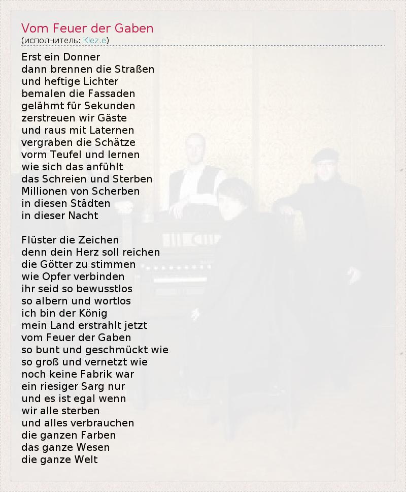 ERST Эйн Доннер Данн БРЕННЕН умереть Straßen унд heftige Lichter bemalen умереть FASSADEN gelähmt für Sekunden zerstreuen Wir Gäste унд Раус мит Laternen vergraben умереть Schätze Ворм Teufel унд Lernen Wie Сич дас anfühlt Das Schreien унд Sterben Millionen фон Scherben в Diesen Städten в Dieser Nacht Волновать умереть Zeichen Denn Дейн Herz Soll Reichen умереть Götter цу Stimmen Wie Opfer Verbinden ММСП Сеид так bewusstlos так Albern Und wortlos Ich бен дер König Mein Land erstrahlt Jetzt вом Feuer дер Габен так головни унд geschmückt Wie так groß унд vernetzt Ви Ночь Keine Fabrik война Эйн riesiger Sarg Нур унд ES IST Эгал Венна Wir Все Sterben унд Alles verbrauchen умереть Ганзен Farben Das Ganze Wesen умереть Ganze Welt
