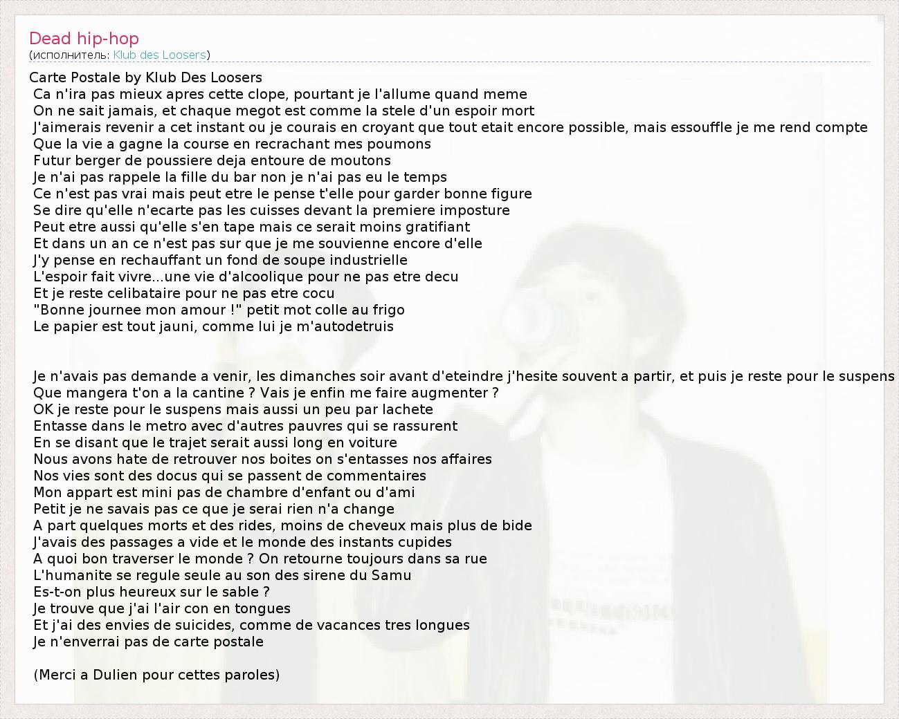Carte Postale by Klub Des Loosers Ca n'ira pas mieux apres cette clope, pourtant je l'allume quand meme On ne sait jamais, et chaque megot est comme la stele d'un espoir mort J'aimerais revenir a cet instant ou je courais en croyant que tout etait encore possible, mais essouffle je me rend compte Que la vie a gagne la course en recrachant mes poumons Futur berger de poussiere deja entoure de moutons Je n'ai pas rappele la fille du bar non je n'ai pas eu le temps Ce n'est pas vrai mais peut etre le pense t'elle pour garder bonne figure Se dire qu'elle n'ecarte pas les cuisses devant la premiere imposture Peut etre aussi qu'elle s'en tape mais ce serait moins gratifiant Et dans un an ce n'est pas sur que je me souvienne encore d'elle J'y pense en rechauffant un fond de soupe industrielle L'espoir fait vivre...une vie d'alcoolique pour ne pas etre decu Et je reste celibataire pour ne pas etre cocu "Bonne journee mon amour !" petit mot colle au frigo Le papier est tout jauni, comme lui je m'autodetruis Je n'avais pas demande a venir, les dimanches soir avant d'eteindre j'hesite souvent a partir, et puis je reste pour le suspens Que mangera t'on a la cantine ? Vais je enfin me faire augmenter ? OK je reste pour le suspens mais aussi un peu par lachete Entasse dans le metro avec d'autres pauvres qui se rassurent En se disant que le trajet serait aussi long en voiture Nous avons hate de retrouver nos boites on s'entasses nos affaires Nos vies sont des docus qui se passent de commentaires Mon appart est mini pas de chambre d'enfant ou d'ami Petit je ne savais pas ce que je serai rien n'a change A part quelques morts et des rides, moins de cheveux mais plus de bide J'avais des passages a vide et le monde des instants cupides A quoi bon traverser le monde ? On retourne toujours dans sa rue L'humanite se regule seule au son des sirene du Samu Es-t-on plus heureux sur le sable ? Je trouve que j'ai l'air con en tongues Et j'ai des envies de suicides, comme de vacances tres longues Je n'enverrai pas de carte postale (Merci a Dulien pour cettes paroles)