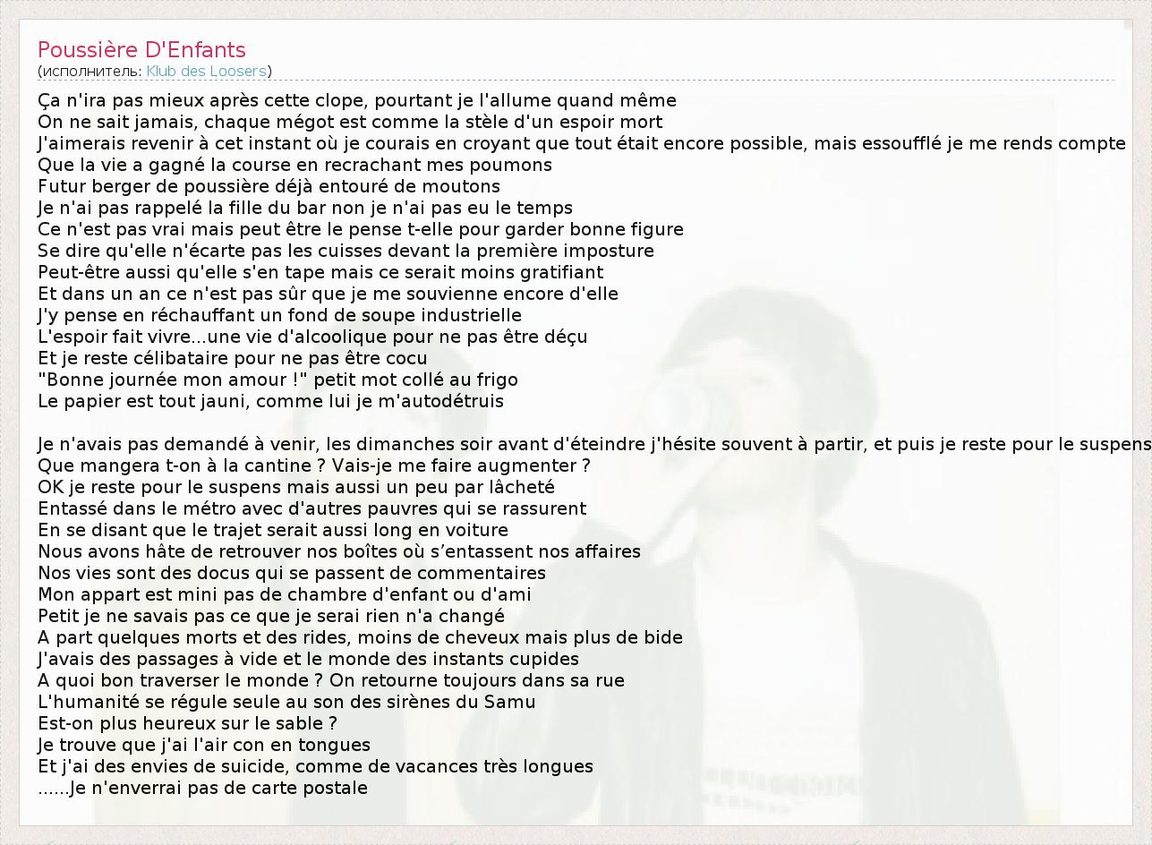 А как ты думаешь, о чем песня "Poussière D'Enfants" ?