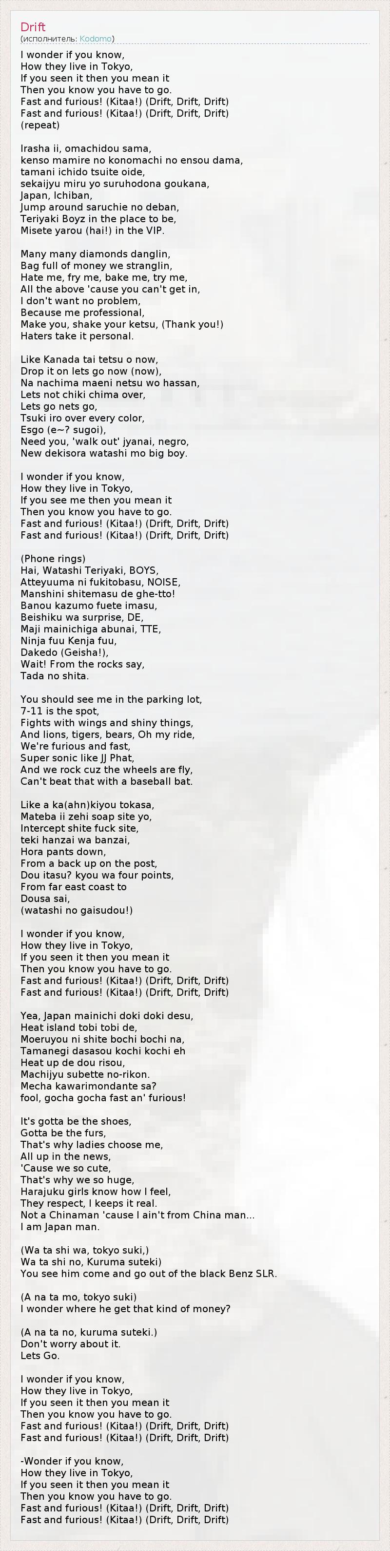 I wonder if you know, How they live in Tokyo, If you seen it then you mean it Then you know you have to go. Fast and furious! (Kitaa!) (Drift, Drift, Drift) Fast and furious! (Kitaa!) (Drift, Drift, Drift) (repeat) Irasha ii, omachidou sama, kenso mamire no konomachi no ensou dama, tamani ichido tsuite oide, sekaijyu miru yo suruhodona goukana, Japan, Ichiban, Jump around saruchie no deban, Teriyaki Boyz in the place to be, Misete yarou (hai!) in the VIP. Many many diamonds danglin, Bag full of money we stranglin, Hate me, fry me, bake me, try me, All the above 'cause you can't get in, I don't want no problem, Because me professional, Make you, shake your ketsu, (Thank you!) Haters take it personal. Like Kanada tai tetsu o now, Drop it on lets go now (now), Na nachima maeni netsu wo hassan, Lets not chiki chima over, Lets go nets go, Tsuki iro over every color, Esgo (e~? sugoi), Need you, 'walk out' jyanai, negro, New dekisora watashi mo big boy. I wonder if you know, How they live in Tokyo, If you see me then you mean it Then you know you have to go. Fast and furious! (Kitaa!) (Drift, Drift, Drift) Fast and furious! (Kitaa!) (Drift, Drift, Drift) (Phone rings) Hai, Watashi Teriyaki, BOYS, Atteyuuma ni fukitobasu, NOISE, Manshini shitemasu de ghe-tto! Banou kazumo fuete imasu, Beishiku wa surprise, DE, Maji mainichiga abunai, TTE, Ninja fuu Kenja fuu, Dakedo (Geisha!), Wait! From the rocks say, Tada no shita. You should see me in the parking lot, 7-11 is the spot, Fights with wings and shiny things, And lions, tigers, bears, Oh my ride, We're furious and fast, Super sonic like JJ Phat, And we rock cuz the wheels are fly, Can't beat that with a baseball bat. Like a ka(ahn)kiyou tokasa, Mateba ii zehi soap site yo, Intercept shite fuck site, teki hanzai wa banzai, Hora pants down, From a back up on the post, Dou itasu? kyou wa four points, From far east coast to Dousa sai, (watashi no gaisudou!) I wonder if you know, How they live in Tokyo, If you seen it then you mean it Then you know you have to go. Fast and furious! (Kitaa!) (Drift, Drift, Drift) Fast and furious! (Kitaa!) (Drift, Drift, Drift) Yea, Japan mainichi doki doki desu, Heat island tobi tobi de, Moeruyou ni shite bochi bochi na, Tamanegi dasasou kochi kochi eh Heat up de dou risou, Machijyu subette no-rikon. Mecha kawarimondante sa? fool, gocha gocha fast an' furious! It's gotta be the shoes, Gotta be the furs, That's why ladies choose me, All up in the news, 'Cause we so cute, That's why we so huge, Harajuku girls know how I feel, They respect, I keeps it real. Not a Chinaman 'cause I ain't from China man... I am Japan man. (Wa ta shi wa, tokyo suki,) Wa ta shi no, Kuruma suteki) You see him come and go out of the black Benz SLR. (A na ta mo, tokyo suki) I wonder where he get that kind of money? (A na ta no, kuruma suteki.) Don't worry about it. Lets Go. I wonder if you know, How they live in Tokyo, If you seen it then you mean it Then you know you have to go. Fast and furious! (Kitaa!) (Drift, Drift, Drift) Fast and furious! (Kitaa!) (Drift, Drift, Drift) -Wonder if you know, How they live in Tokyo, If you seen it then you mean it Then you know you have to go. Fast and furious! (Kitaa!) (Drift, Drift, Drift) Fast and furious! (Kitaa!) (Drift, Drift, Drift)
