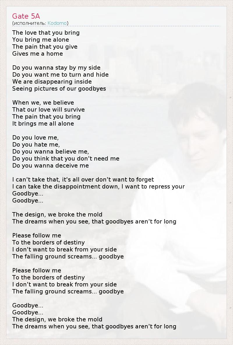 The love that you bring You bring me alone The pain that you give Gives me a home Do you wanna stay by my side Do you want me to turn and hide We are disappearing inside Seeing pictures of our goodbyes When we, we believe That our love will survive The pain that you bring It brings me all alone Do you love me, Do you hate me, Do you wanna believe me, Do you think that you don't need me Do you wanna deceive me I can't take that, it's all over don't want to forget I can take the disappointment down, I want to repress your Goodbye... Goodbye... The design, we broke the mold The dreams when you see, that goodbyes aren't for long Please follow me To the borders of destiny I don't want to break from your side The falling ground screams... goodbye Please follow me To the borders of destiny I don't want to break from your side The falling ground screams... goodbye Goodbye... Goodbye... The design, we broke the mold The dreams when you see, that goodbyes aren't for long