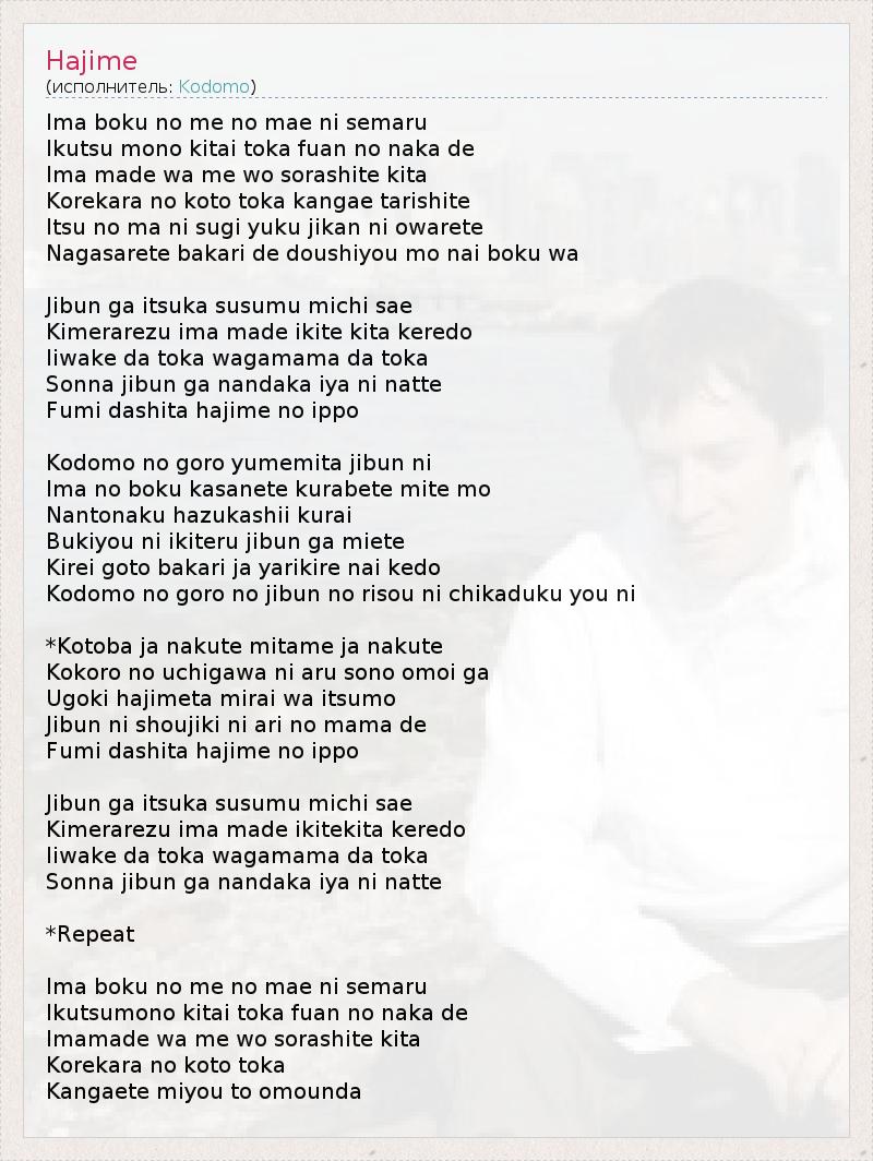 Ima boku no me no mae ni semaru Ikutsu mono kitai toka fuan no naka de Ima made wa me wo sorashite kita Korekara no koto toka kangae tarishite Itsu no ma ni sugi yuku jikan ni owarete Nagasarete bakari de doushiyou mo nai boku wa Jibun ga itsuka susumu michi sae Kimerarezu ima made ikite kita keredo Iiwake da toka wagamama da toka Sonna jibun ga nandaka iya ni natte Fumi dashita hajime no ippo Kodomo no goro yumemita jibun ni Ima no boku kasanete kurabete mite mo Nantonaku hazukashii kurai Bukiyou ni ikiteru jibun ga miete Kirei goto bakari ja yarikire nai kedo Kodomo no goro no jibun no risou ni chikaduku you ni *Kotoba ja nakute mitame ja nakute Kokoro no uchigawa ni aru sono omoi ga Ugoki hajimeta mirai wa itsumo Jibun ni shoujiki ni ari no mama de Fumi dashita hajime no ippo Jibun ga itsuka susumu michi sae Kimerarezu ima made ikitekita keredo Iiwake da toka wagamama da toka Sonna jibun ga nandaka iya ni natte *Repeat Ima boku no me no mae ni semaru Ikutsumono kitai toka fuan no naka de Imamade wa me wo sorashite kita Korekara no koto toka Kangaete miyou to omounda