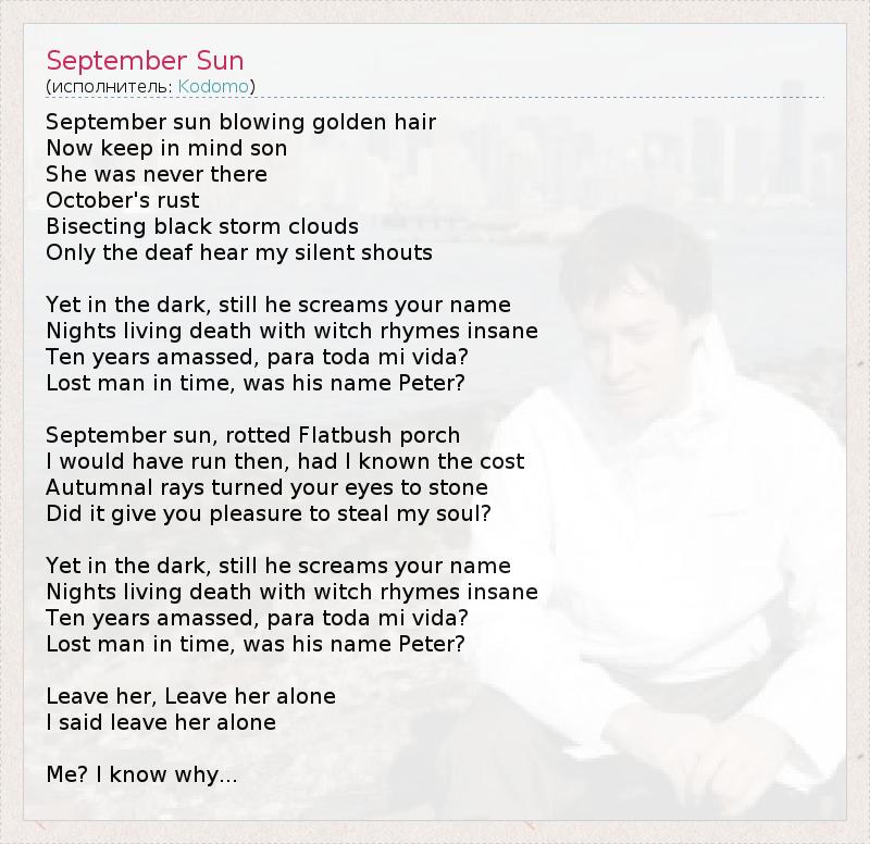 Сентябрьское солнце раздувает золотистые волосы. Теперь запоминай, сынок: Её никогда там не было. Октябрьская ржавчина Сквозь темные облака пробивает свой путь. Только глухому под силу услышать мои безмолвные крики. В темноте, все ещё, он выкрикивает твоё имя. Ночь – это как умереть, будучи живым, безрассудство рифмы. Десять лет накопилось - на всю мою жизнь? Потерянный во времени человек, не Питер ли его имя? Сентябрьское солнце, загнивающие подъезды Флэтбуш, 1 Теперь я бы сбежал, знать бы прежде цену. Осенние лучи превратили твои глаза в камень, Тебе доставляет удовольствие красть мою душу? В темноте, все ещё, он выкрикивает твоё имя. Ночь – это как умереть, будучи живым, безрассудство рифмы. Десять лет накопилось - на всю мою жизнь? Потерянный во времени человек, не Питер ли его имя? Оставь её, оставь её, Оставь её, я сказал. Я? Я знаю почему... 1 - Flatbush – коммуна в Нью-Йорке