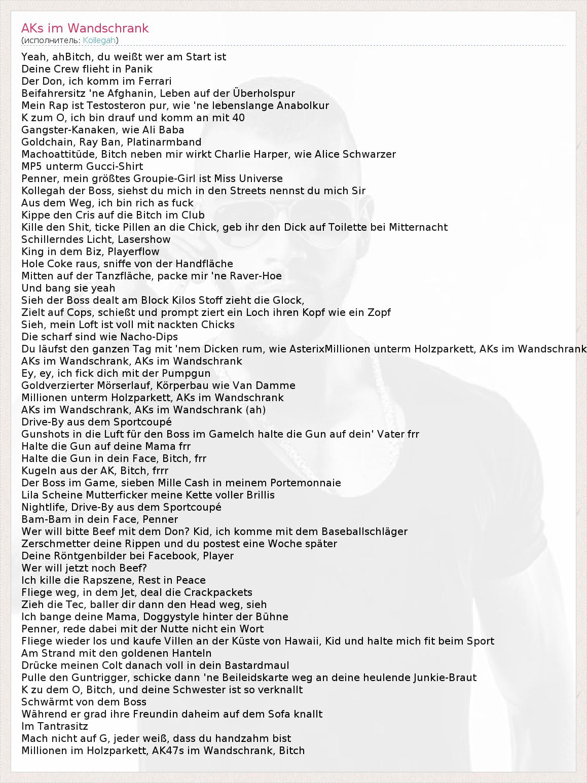 Yeah, ahBitch, du weißt wer am Start ist Deine Crew flieht in Panik Der Don, ich komm im Ferrari Beifahrersitz 'ne Afghanin, Leben auf der Überholspur Mein Rap ist Testosteron pur, wie 'ne lebenslange Anabolkur K zum O, ich bin drauf und komm an mit 40 Gangster-Kanaken, wie Ali Baba Goldchain, Ray Ban, Platinarmband Machoattitüde, Bitch neben mir wirkt Charlie Harper, wie Alice Schwarzer MP5 unterm Gucci-Shirt Penner, mein größtes Groupie-Girl ist Miss Universe Kollegah der Boss, siehst du mich in den Streets nennst du mich Sir Aus dem Weg, ich bin rich as fuck Kippe den Cris auf die Bitch im Club Kille den Shit, ticke Pillen an die Chick, geb ihr den Dick auf Toilette bei Mitternacht Schillerndes Licht, Lasershow King in dem Biz, Playerflow Hole Coke raus, sniffe von der Handfläche Mitten auf der Tanzfläche, packe mir 'ne Raver-Hoe Und bang sie yeah Sieh der Boss dealt am Block Kilos Stoff zieht die Glock, Zielt auf Cops, schießt und prompt ziert ein Loch ihren Kopf wie ein Zopf Sieh, mein Loft ist voll mit nackten Chicks Die scharf sind wie Nacho-Dips Du läufst den ganzen Tag mit 'nem Dicken rum, wie AsterixMillionen unterm Holzparkett, AKs im Wandschrank AKs im Wandschrank, AKs im Wandschrank Ey, ey, ich fick dich mit der Pumpgun Goldverzierter Mörserlauf, Körperbau wie Van Damme Millionen unterm Holzparkett, AKs im Wandschrank AKs im Wandschrank, AKs im Wandschrank (ah) Drive-By aus dem Sportcoupé Gunshots in die Luft für den Boss im GameIch halte die Gun auf dein' Vater frr Halte die Gun auf deine Mama frr Halte die Gun in dein Face, Bitch, frr Kugeln aus der AK, Bitch, frrr Der Boss im Game, sieben Mille Cash in meinem Portemonnaie Lila Scheine Mutterficker meine Kette voller Brillis Nightlife, Drive-By aus dem Sportcoupé Bam-Bam in dein Face, Penner Wer will bitte Beef mit dem Don? Kid, ich komme mit dem Baseballschläger Zerschmetter deine Rippen und du postest eine Woche später Deine Röntgenbilder bei Facebook, Player Wer will jetzt noch Beef? Ich kille die Rapszene, Rest in Peace Fliege weg, in dem Jet, deal die Crackpackets Zieh die Tec, baller dir dann den Head weg, sieh Ich bange deine Mama, Doggystyle hinter der Bühne Penner, rede dabei mit der Nutte nicht ein Wort Fliege wieder los und kaufe Villen an der Küste von Hawaii, Kid und halte mich fit beim Sport Am Strand mit den goldenen Hanteln Drücke meinen Colt danach voll in dein Bastardmaul Pulle den Guntrigger, schicke dann 'ne Beileidskarte weg an deine heulende Junkie-Braut K zu dem O, Bitch, und deine Schwester ist so verknallt Schwärmt von dem Boss Während er grad ihre Freundin daheim auf dem Sofa knallt Im Tantrasitz Mach nicht auf G, jeder weiß, dass du handzahm bist Millionen im Holzparkett, AK47s im Wandschrank, Bitch