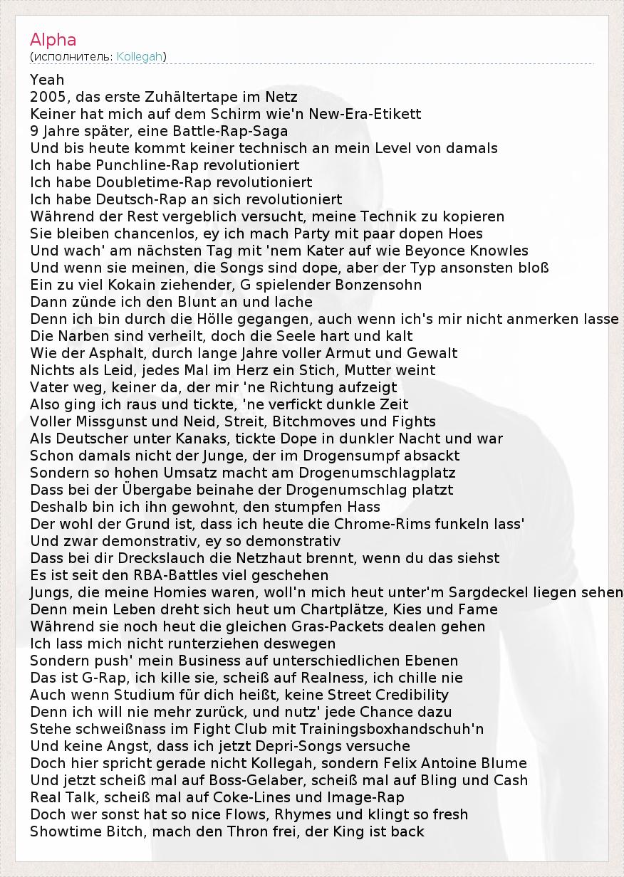 Yeah 2005, das erste Zuhältertape im Netz Keiner hat mich auf dem Schirm wie'n New-Era-Etikett 9 Jahre später, eine Battle-Rap-Saga Und bis heute kommt keiner technisch an mein Level von damals Ich habe Punchline-Rap revolutioniert Ich habe Doubletime-Rap revolutioniert Ich habe Deutsch-Rap an sich revolutioniert Während der Rest vergeblich versucht, meine Technik zu kopieren Sie bleiben chancenlos, ey ich mach Party mit paar dopen Hoes Und wach' am nächsten Tag mit 'nem Kater auf wie Beyonce Knowles Und wenn sie meinen, die Songs sind dope, aber der Typ ansonsten bloß Ein zu viel Kokain ziehender, G spielender Bonzensohn Dann zünde ich den Blunt an und lache Denn ich bin durch die Hölle gegangen, auch wenn ich's mir nicht anmerken lasse Die Narben sind verheilt, doch die Seele hart und kalt Wie der Asphalt, durch lange Jahre voller Armut und Gewalt Nichts als Leid, jedes Mal im Herz ein Stich, Mutter weint Vater weg, keiner da, der mir 'ne Richtung aufzeigt Also ging ich raus und tickte, 'ne verfickt dunkle Zeit Voller Missgunst und Neid, Streit, Bitchmoves und Fights Als Deutscher unter Kanaks, tickte Dope in dunkler Nacht und war Schon damals nicht der Junge, der im Drogensumpf absackt Sondern so hohen Umsatz macht am Drogenumschlagplatz Dass bei der Übergabe beinahe der Drogenumschlag platzt Deshalb bin ich ihn gewohnt, den stumpfen Hass Der wohl der Grund ist, dass ich heute die Chrome-Rims funkeln lass' Und zwar demonstrativ, ey so demonstrativ Dass bei dir Dreckslauch die Netzhaut brennt, wenn du das siehst Es ist seit den RBA-Battles viel geschehen Jungs, die meine Homies waren, woll'n mich heut unter'm Sargdeckel liegen sehen Denn mein Leben dreht sich heut um Chartplätze, Kies und Fame Während sie noch heut die gleichen Gras-Packets dealen gehen Ich lass mich nicht runterziehen deswegen Sondern push' mein Business auf unterschiedlichen Ebenen Das ist G-Rap, ich kille sie, scheiß auf Realness, ich chille nie Auch wenn Studium für dich heißt, keine Street Credibility Denn ich will nie mehr zurück, und nutz' jede Chance dazu Stehe schweißnass im Fight Club mit Trainingsboxhandschuh'n Und keine Angst, dass ich jetzt Depri-Songs versuche Doch hier spricht gerade nicht Kollegah, sondern Felix Antoine Blume Und jetzt scheiß mal auf Boss-Gelaber, scheiß mal auf Bling und Cash Real Talk, scheiß mal auf Coke-Lines und Image-Rap Doch wer sonst hat so nice Flows, Rhymes und klingt so fresh Showtime Bitch, mach den Thron frei, der King ist back
