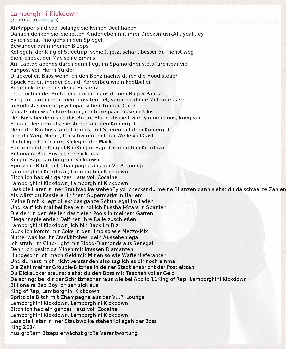 AhRapper sind cool solange sie keinen Deal haben Danach denken sie, sie retten Kinderleben mit ihrer DrecksmusikAh, yeah, ey Ey ich schau morgens in den Spiegel Bewunder dann meinen Bizeps Kollegah, der King of Streetrap, schießt jetzt scharf, besser du fliehst weg Sieh, checkt der Mac seine Emails Am Laptop abends durch dann liegt im Spamordner stets furchtbar viel Fanpost von Herrn Yurderi Druckvoller, Bass wenn ich den Benz nachts durch die Hood steuer Spuck Feuer, mörder Sound, Körperbau wie'n Footballer Schmuck teurer, als deine Existenz Treff dich in der Suite und box dich aus deinen Baggy-Pants Flieg zu Terminen in 'nem privatem Jet, verdiene da ne Milliarde Cash In Südostasien mit psychopatischen Triaden-Chefs Monatslohn wie'n Koksbaron, ich ticke paar tausend Kilos Der Boss bei dem sich das Biz im Block abspielt wie Daumenkinos, krieg von Frauen Deepthroats, sie stieren auf den Kühlergrill Denn der Rapboss fährt Lambos, mit Stieren auf dem Kühlergrill Geh da Weg, Mann!, Ich schwimm mit der Welle voll Cash Du billiger Crackjunk, Kollegah der Mack Für immer der King of RapKing of Rap! Lamborghini Kickdown Billionaire Bad Boy ich seh sick aus King of Rap, Lamborghini Kickdown Spritz die Bitch mit Champagne aus der V.I.P. Lounge Lamborghini Kickdown, Lamborghini Kickdown Bitch ich hab ein ganzes Haus voll Cocaine Lamborghini Kickdown, Lamborghini Kickdown Lass die Hater in 'ner Staubwolke stehenEy yo, checkst du meine Bilanzen dann siehst du da schwarze Zahlen Als wärst du Kassierer in 'nem Supermarkt in Harlem Meine Bitch kriegt direkt das ganze Schuhregal im Laden Und kauf ich mal bei Real ein hol ich Fussball-Stars in Spanien Die den in den Wellen des tiefen Pools in meinem Garten Elegant spielenden Delfinen ihre Bälle zuschießen Lamborghini Kickdown, ich bin Back im Biz Guck ich komm mit Coke in der Limo so wie Mezzo-Mix Nutte, was los ihr Crackbitches, dein Aussehen egal Ich strahl im Club-Light mit Blood-Diamonds aus Senegal Denn ich besitz da Minen mit krassen Diamanten Hundesohn ich mach Geld mit Minen so wie Waffenlieferanten Und du hast mich nicht verstanden also sag ich es dir noch einmal Die Zahl meiner Groupie-Bitches in deiner Stadt enspricht der Postleitzahl Du Dicksucker staunst siehst du den Boss mit Taschen voller Geld Da springt bei dir der Schrittmacher raus wie bei Apollo 11King of Rap! Lamborghini Kickdown Billionaire Bad Boy ich seh sick aus King of Rap, Lamborghini Kickdown Spritz die Bitch mit Champagne aus der V.I.P. Lounge Lamborghini Kickdown, Lamborghini Kickdown Bitch ich hab ein ganzes Haus voll Cocaine Lamborghini Kickdown, Lamborghini Kickdown Lass die Hater in 'ner Staubwolke stehenKollegah der Boss King 2014 Aus großem Bizeps erwächst große Verantwortung