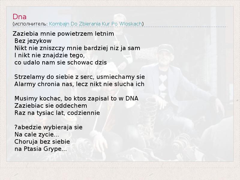 Это интересно:Польская альтернативная рок-группа, происходящих из городка Nowy Dworek, неподалеку от Swiebodzin, основанная в 2001 году.Состав: Marcin Zagański (вокал), Томас Brażewicz-Dosiółko (гитара, лидер группы), Paweł Koprowski (гитара), Witold Przepióra (бас), Mario Bielski (ударные).В 2003 году группа победила на рок-фестивале в Węgorzewo и 17 января 2005 года под эгидой радио "Тройка" выпустила свой дебютный альбом - "Ósme piętro". 23 октября... продолжение