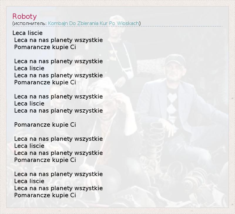 Это интересно:Польская альтернативная рок-группа, происходящих из городка Nowy Dworek, неподалеку от Swiebodzin, основанная в 2001 году.Состав: Marcin Zagański (вокал), Томас Brażewicz-Dosiółko (гитара, лидер группы), Paweł Koprowski (гитара), Witold Przepióra (бас), Mario Bielski (ударные).В 2003 году группа победила на рок-фестивале в Węgorzewo и 17 января 2005 года под эгидой радио "Тройка" выпустила свой дебютный альбом - "Ósme piętro". 23 октября... продолжение