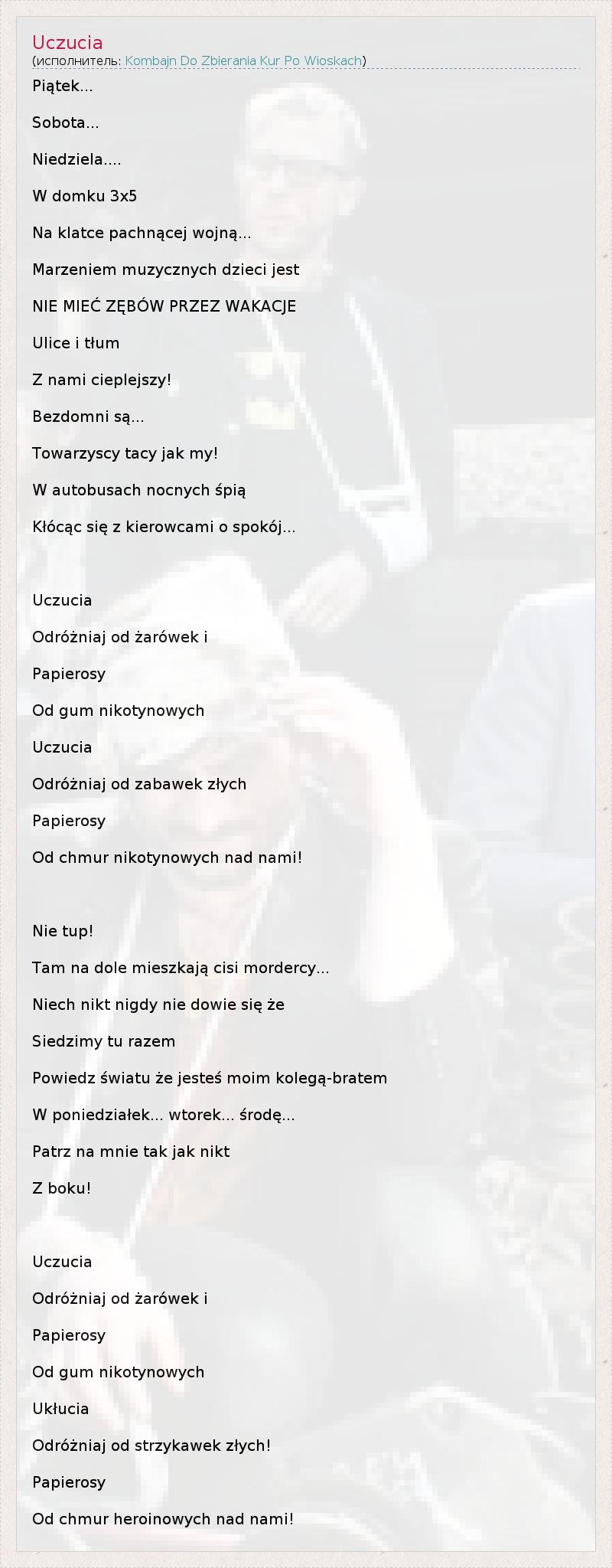 Это интересно:Польская альтернативная рок-группа, происходящих из городка Nowy Dworek, неподалеку от Swiebodzin, основанная в 2001 году.Состав: Marcin Zagański (вокал), Томас Brażewicz-Dosiółko (гитара, лидер группы), Paweł Koprowski (гитара), Witold Przepióra (бас), Mario Bielski (ударные).В 2003 году группа победила на рок-фестивале в Węgorzewo и 17 января 2005 года под эгидой радио "Тройка" выпустила свой дебютный альбом - "Ósme piętro". 23 октября... продолжение