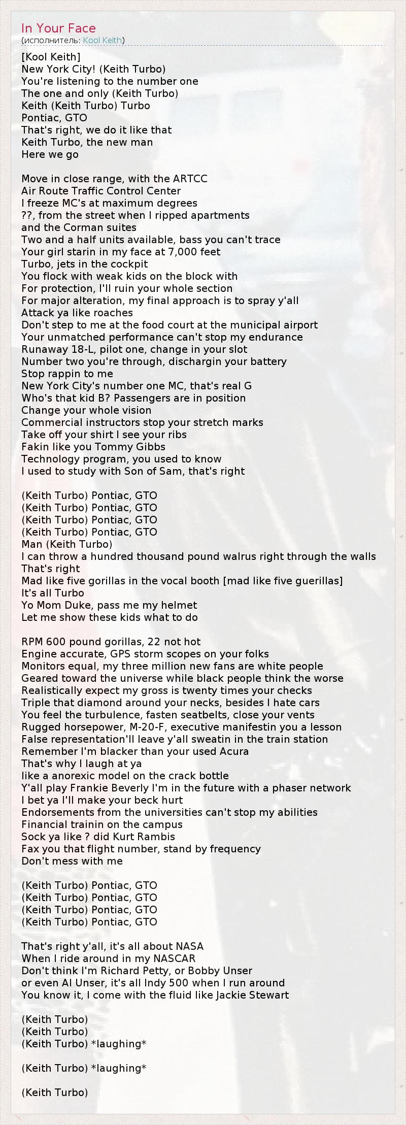 [Kool Keith] New York City! (Keith Turbo) You're listening to the number one The one and only (Keith Turbo) Keith (Keith Turbo) Turbo Pontiac, GTO That's right, we do it like that Keith Turbo, the new man Here we go Move in close range, with the ARTCC Air Route Traffic Control Center I freeze MC's at maximum degrees ??, from the street when I ripped apartments and the Corman suites Two and a half units available, bass you can't trace Your girl starin in my face at 7,000 feet Turbo, jets in the cockpit You flock with weak kids on the block with For protection, I'll ruin your whole section For major alteration, my final approach is to spray y'all Attack ya like roaches Don't step to me at the food court at the municipal airport Your unmatched performance can't stop my endurance Runaway 18-L, pilot one, change in your slot Number two you're through, dischargin your battery Stop rappin to me New York City's number one MC, that's real G Who's that kid B? Passengers are in position Change your whole vision Commercial instructors stop your stretch marks Take off your shirt I see your ribs Fakin like you Tommy Gibbs Technology program, you used to know I used to study with Son of Sam, that's right (Keith Turbo) Pontiac, GTO (Keith Turbo) Pontiac, GTO (Keith Turbo) Pontiac, GTO (Keith Turbo) Pontiac, GTO Man (Keith Turbo) I can throw a hundred thousand pound walrus right through the walls That's right Mad like five gorillas in the vocal booth [mad like five guerillas] It's all Turbo Yo Mom Duke, pass me my helmet Let me show these kids what to do RPM 600 pound gorillas, 22 not hot Engine accurate, GPS storm scopes on your folks Monitors equal, my three million new fans are white people Geared toward the universe while black people think the worse Realistically expect my gross is twenty times your checks Triple that diamond around your necks, besides I hate cars You feel the turbulence, fasten seatbelts, close your vents Rugged horsepower, M-20-F, executive manifestin you a lesson False representation'll leave y'all sweatin in the train station Remember I'm blacker than your used Acura That's why I laugh at ya like a anorexic model on the crack bottle Y'all play Frankie Beverly I'm in the future with a phaser network I bet ya I'll make your beck hurt Endorsements from the universities can't stop my abilities Financial trainin on the campus Sock ya like ? did Kurt Rambis Fax you that flight number, stand by frequency Don't mess with me (Keith Turbo) Pontiac, GTO (Keith Turbo) Pontiac, GTO (Keith Turbo) Pontiac, GTO (Keith Turbo) Pontiac, GTO That's right y'all, it's all about NASA When I ride around in my NASCAR Don't think I'm Richard Petty, or Bobby Unser or even Al Unser, it's all Indy 500 when I run around You know it, I come with the fluid like Jackie Stewart (Keith Turbo) (Keith Turbo) (Keith Turbo) *laughing* (Keith Turbo) *laughing* (Keith Turbo)