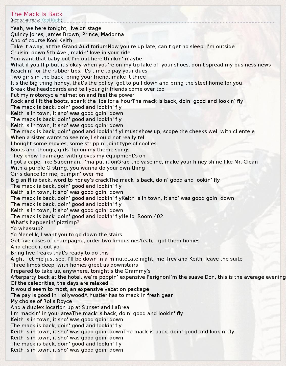 Yeah, we here tonight, live on stage Quincy Jones, James Brown, Prince, Madonna And of course Kool Keith Take it away, at the Grand AuditoriumNow you're up late, can't get no sleep, I'm outside Cruisin' down 5th Ave., makin' love in your ride You want that baby but I'm out here thinkin' maybe What if you flip but it's okay when you're on my tipTake off your shoes, don't spread my business news Reachin' for the rubber tips, it's time to pay your dues Two girls in the back, bring your friend, make it three It's the big thing honey, that's the policyI got to pull down and bring the steel home for you Break the headboards and tell your girlfriends come over too Put my motorcycle helmet on and feel the power Rock and lift the boots, spank the lips for a hourThe mack is back, doin' good and lookin' fly The mack is back, doin' good and lookin' fly Keith is in town, it sho' was good goin' down The mack is back, doin' good and lookin' fly Keith is in town, it sho' was good goin' down The mack is back, doin' good and lookin' flyI must show up, scope the cheeks well with clientele When a sister wants to see me, I should not really tell I bought some movies, some strippin' joint type of coolies Boots and thongs, girls flip on my theme songs They know I damage, with gloves my equipment's on I got a cape, like Superman, I'ma put it onGrab the vaseline, make your hiney shine like Mr. Clean With a purple G-string, you wanna do your own thing Girls dance for me, pumpin' over me Big sniff is back, word to honey's crackThe mack is back, doin' good and lookin' fly The mack is back, doin' good and lookin' fly Keith is in town, it sho' was good goin' down The mack is back, doin' good and lookin' flyKeith is in town, it sho' was good goin' down The mack is back, doin' good and lookin' fly Keith is in town, it sho' was good goin' down The mack is back, doin' good and lookin' flyHello, Room 402 What's happenin' pizzimp? Yo whassup? Yo Menelik, I want you to go down the stairs Get five cases of champagne, order two limousinesYeah, I got them honies And check it out yo Bring five freaks that's ready to do this Aight, let me just see, I'll be down in a minuteLate night, me Trev and Keith, leave the suite Three limos deep, with honies greet us downstairs Prepared to take us, anywhere, tonight's the Grammy's Afterparty back at the hotel, we're poppin' expensive PerignonI'm the suave Don, this is the average evening Of the celebrities, the days are relaxed It would seem to most, an expensive vacation package The pay is good in HollywoodA hustler has to mack in fresh gear My choise of Rolls Royce And a duplex location up at Sunset and LaBrea I'm mackin' in your areaThe mack is back, doin' good and lookin' fly Keith is in town, it sho' was good goin' down The mack is back, doin' good and lookin' fly Keith is in town, it sho' was good goin' downThe mack is back, doin' good and lookin' fly Keith is in town, it sho' was good goin' down The mack is back, doin' good and lookin' fly Keith is in town, it sho' was good goin' down