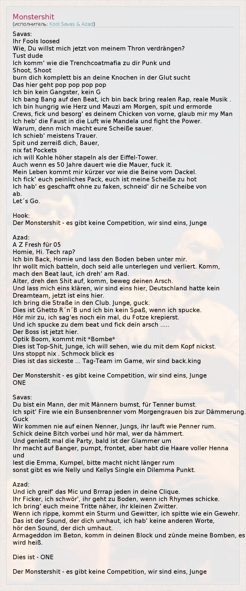 Savas: Ihr Fools loosed Wie, Du willst mich jetzt von meinem Thron verdrängen? Tust dude Ich komm' wie die Trenchcoatmafia zu dir Punk und Shoot, Shoot burn dich komplett bis an deine Knochen in der Glut sucht Das hier geht pop pop pop pop Ich bin kein Gangster, kein G Ich bang Bang auf den Beat, ich bin back bring realen Rap, reale Musik . Ich bin hungrig wie Herz und Mauzi am Morgen, spit und ermorde Crews, fick und besorg' es deinem Chicken von vorne, glaub mir my Man Ich heb' die Faust in die Luft wie Mandela und fight the Power. Warum, denn mich macht eure Scheiße sauer. Ich schieb' meistens Trauer. Spit und zerreiß dich, Bauer, nix fat Pockets ich will Kohle höher stapeln als der Eiffel-Tower. Auch wenn es 50 Jahre dauert wie die Mauer, fuck it. Mein Leben kommt mir kürzer vor wie die Beine vom Dackel. Ich fick' euch peinliches Pack, euch ist meine Scheiße zu hot Ich hab' es geschafft ohne zu faken, schneid' dir ne Scheibe von ab. Let´s Go. Hook: Der Monstershit - es gibt keine Competition, wir sind eins, Junge Azad: A Z Fresh für 05 Homie, Hi. Tech rap? Ich bin Back, Homie und lass den Boden beben unter mir. Ihr wollt mich batteln, doch seid alle unterlegen und verliert. Komm, mach den Beat laut, ich dreh' am Rad. Alter, dreh den Shit auf, komm, beweg deinen Arsch. Und lass mich eins klären, wir sind eins hier, Deutschland hatte kein Dreamteam, jetzt ist eins hier. Ich bring die Straße in den Club. Junge, guck. Dies ist Ghetto R´n´B und ich bin kein Spaß, wenn ich spucke. Hör mir zu, ich sag'es noch ein mal, du Fotze krepierst. Und ich spucke zu dem beat und fick dein arsch ..... Der Boss ist jetzt hier. Optik Boom, kommt mit *Bombe* Dies ist Top-Shit, Junge, ich will sehen, wie du mit dem Kopf nickst. Uns stoppt nix . Schmock blick es Dies ist das sickeste ... Tag-Team im Game, wir sind back.king Der Monstershit - es gibt keine Competition, wir sind eins, Junge ONE Savas: Du bist ein Mann, der mit Männern bumst, für Tenner bumst. Ich spit' Fire wie ein Bunsenbrenner vom Morgengrauen bis zur Dämmerung. Guck Wir kommen nie auf einen Nenner, Jungs, ihr lauft wie Penner rum. Schick deine Bitch vorbei und hör mal, wer da hämmert. Und genießt mal die Party, bald ist der Glammer um Ihr macht auf Banger, pumpt, frontet, aber habt die Haare voller Henna und lest die Emma, Kumpel, bitte macht nicht länger rum sonst gibt es wie Nelly und Kellys Single ein Dilemma Punkt. Azad: Und ich greif' das Mic und Brrrap jeden in deine Clique. Ihr Ficker, ich schwör', ihr geht zu Boden, wenn ich Rhymes schicke. Ich bring' euch meine Tritte näher, ihr kleinen Zwitter. Wenn ich rippe, kommt ein Sturm und Gewitter, ich spitte wie ein Gewehr. Das ist der Sound, der dich umhaut, ich hab' keine anderen Worte, hör den Sound, der dich umhaut. Armageddon im Beton, komm in deinen Block und zünde meine Bomben, es wird heiß. Dies ist - ONE Der Monstershit - es gibt keine Competition, wir sind eins, Junge