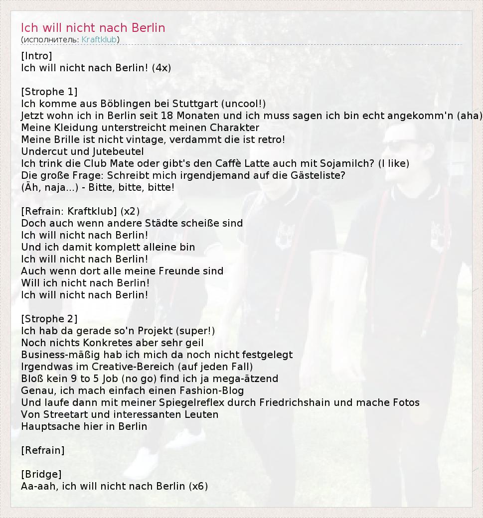 [Intro] Ich will nicht nach Berlin! (4x) [Strophe 1] Ich komme aus Böblingen bei Stuttgart (uncool!) Jetzt wohn ich in Berlin seit 18 Monaten und ich muss sagen ich bin echt angekomm'n (aha) Meine Kleidung unterstreicht meinen Charakter Meine Brille ist nicht vintage, verdammt die ist retro! Undercut und Jutebeutel Ich trink die Club Mate oder gibt's den Caffè Latte auch mit Sojamilch? (I like) Die große Frage: Schreibt mich irgendjemand auf die Gästeliste? (Äh, naja...) - Bitte, bitte, bitte! [Refrain: Kraftklub] (x2) Doch auch wenn andere Städte scheiße sind Ich will nicht nach Berlin! Und ich damit komplett alleine bin Ich will nicht nach Berlin! Auch wenn dort alle meine Freunde sind Will ich nicht nach Berlin! Ich will nicht nach Berlin! [Strophe 2] Ich hab da gerade so'n Projekt (super!) Noch nichts Konkretes aber sehr geil Business-mäßig hab ich mich da noch nicht festgelegt Irgendwas im Creative-Bereich (auf jeden Fall) Bloß kein 9 to 5 Job (no go) find ich ja mega-ätzend Genau, ich mach einfach einen Fashion-Blog Und laufe dann mit meiner Spiegelreflex durch Friedrichshain und mache Fotos Von Streetart und interessanten Leuten Hauptsache hier in Berlin [Refrain] [Bridge] Aa-aah, ich will nicht nach Berlin (x6)