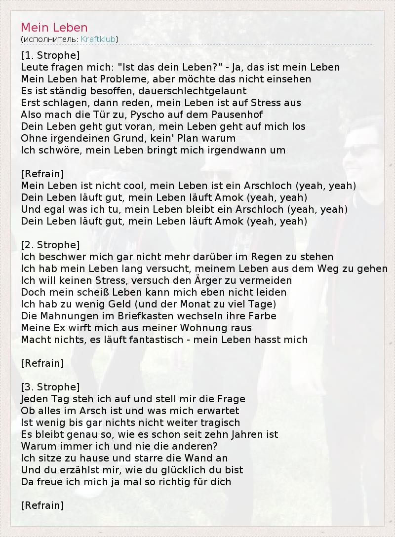 [1. Strophe] Leute fragen mich: "Ist das dein Leben?" - Ja, das ist mein Leben Mein Leben hat Probleme, aber möchte das nicht einsehen Es ist ständig besoffen, dauerschlechtgelaunt Erst schlagen, dann reden, mein Leben ist auf Stress aus Also mach die Tür zu, Pyscho auf dem Pausenhof Dein Leben geht gut voran, mein Leben geht auf mich los Ohne irgendeinen Grund, kein' Plan warum Ich schwöre, mein Leben bringt mich irgendwann um [Refrain] Mein Leben ist nicht cool, mein Leben ist ein Arschloch (yeah, yeah) Dein Leben läuft gut, mein Leben läuft Amok (yeah, yeah) Und egal was ich tu, mein Leben bleibt ein Arschloch (yeah, yeah) Dein Leben läuft gut, mein Leben läuft Amok (yeah, yeah) [2. Strophe] Ich beschwer mich gar nicht mehr darüber im Regen zu stehen Ich hab mein Leben lang versucht, meinem Leben aus dem Weg zu gehen Ich will keinen Stress, versuch den Ärger zu vermeiden Doch mein scheiß Leben kann mich eben nicht leiden Ich hab zu wenig Geld (und der Monat zu viel Tage) Die Mahnungen im Briefkasten wechseln ihre Farbe Meine Ex wirft mich aus meiner Wohnung raus Macht nichts, es läuft fantastisch - mein Leben hasst mich [Refrain] [3. Strophe] Jeden Tag steh ich auf und stell mir die Frage Ob alles im Arsch ist und was mich erwartet Ist wenig bis gar nichts nicht weiter tragisch Es bleibt genau so, wie es schon seit zehn Jahren ist Warum immer ich und nie die anderen? Ich sitze zu hause und starre die Wand an Und du erzählst mir, wie du glücklich du bist Da freue ich mich ja mal so richtig für dich [Refrain]