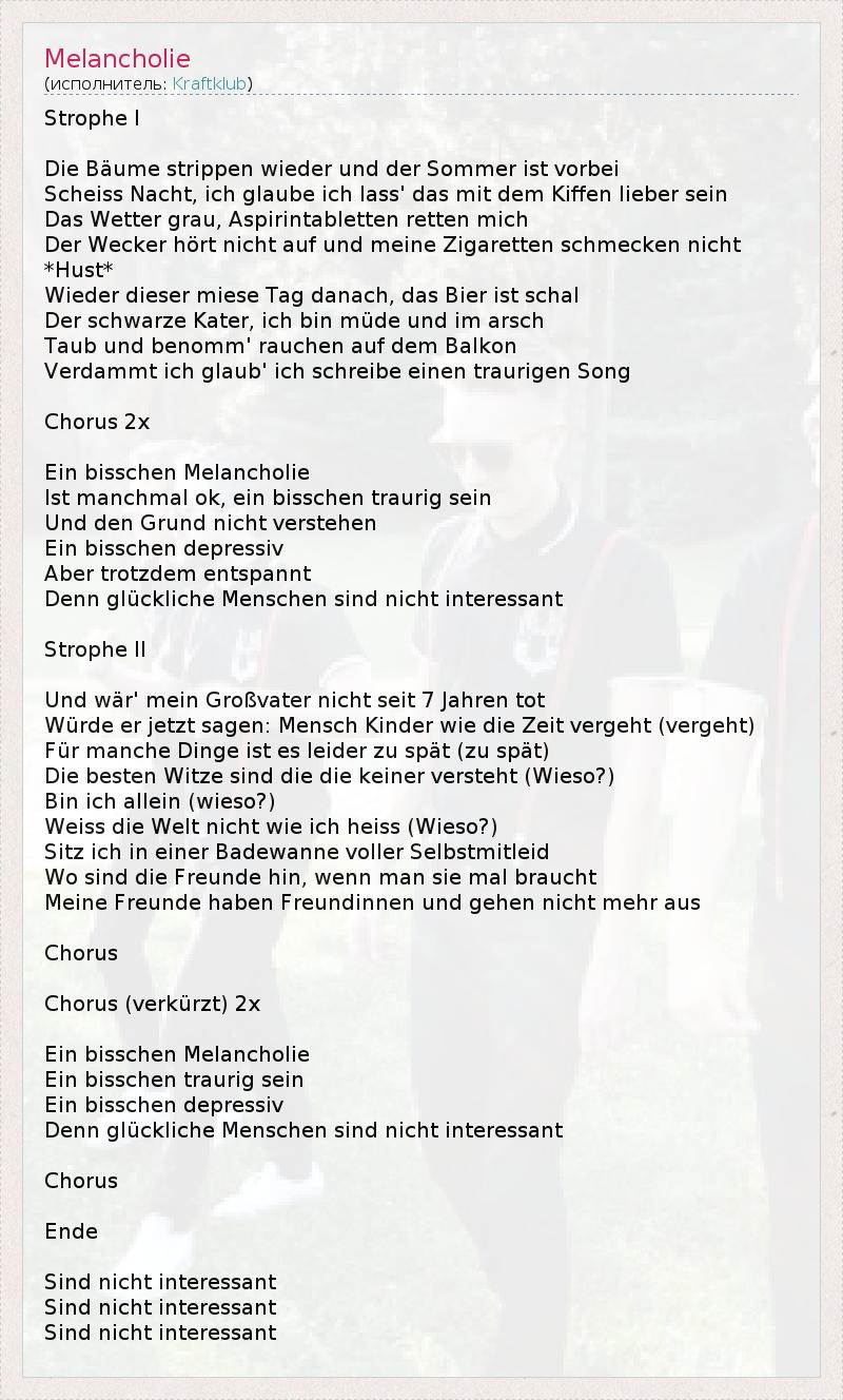 Strophe I Die Bäume strippen wieder und der Sommer ist vorbei Scheiss Nacht, ich glaube ich lass' das mit dem Kiffen lieber sein Das Wetter grau, Aspirintabletten retten mich Der Wecker hört nicht auf und meine Zigaretten schmecken nicht *Hust* Wieder dieser miese Tag danach, das Bier ist schal Der schwarze Kater, ich bin müde und im arsch Taub und benomm' rauchen auf dem Balkon Verdammt ich glaub' ich schreibe einen traurigen Song Chorus 2x Ein bisschen Melancholie Ist manchmal ok, ein bisschen traurig sein Und den Grund nicht verstehen Ein bisschen depressiv Aber trotzdem entspannt Denn glückliche Menschen sind nicht interessant Strophe II Und wär' mein Großvater nicht seit 7 Jahren tot Würde er jetzt sagen: Mensch Kinder wie die Zeit vergeht (vergeht) Für manche Dinge ist es leider zu spät (zu spät) Die besten Witze sind die die keiner versteht (Wieso?) Bin ich allein (wieso?) Weiss die Welt nicht wie ich heiss (Wieso?) Sitz ich in einer Badewanne voller Selbstmitleid Wo sind die Freunde hin, wenn man sie mal braucht Meine Freunde haben Freundinnen und gehen nicht mehr aus Chorus Chorus (verkürzt) 2x Ein bisschen Melancholie Ein bisschen traurig sein Ein bisschen depressiv Denn glückliche Menschen sind nicht interessant Chorus Ende Sind nicht interessant Sind nicht interessant Sind nicht interessant