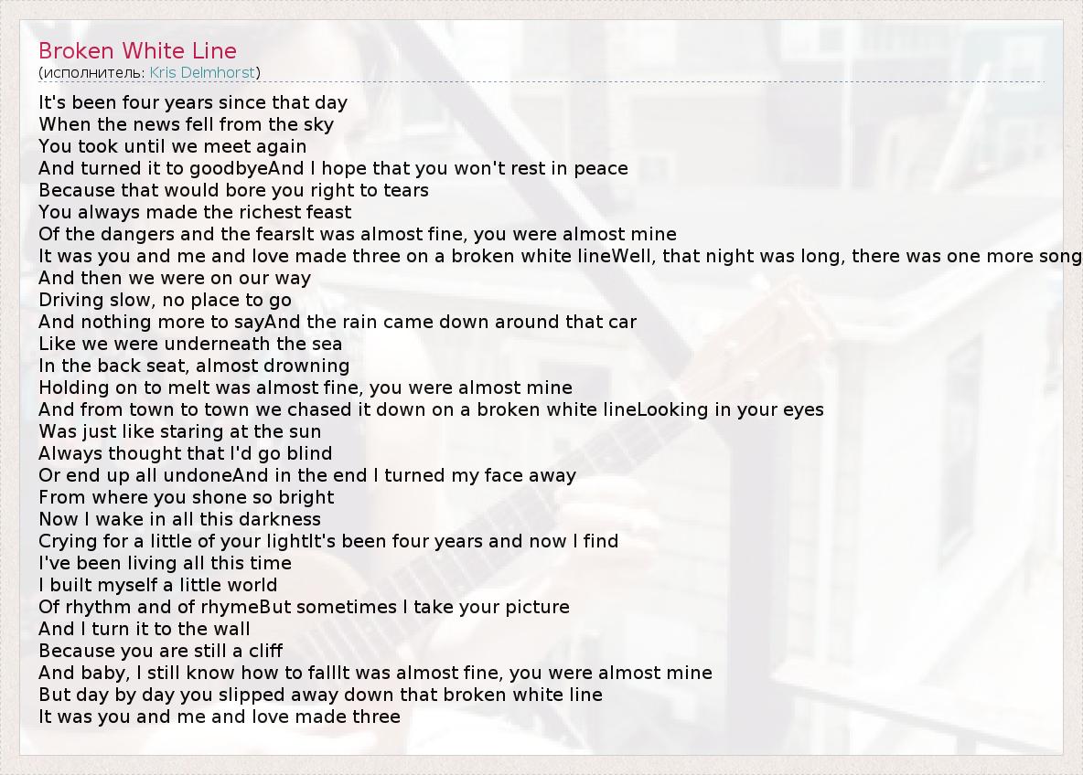 It's been four years since that day When the news fell from the sky You took until we meet again And turned it to goodbyeAnd I hope that you won't rest in peace Because that would bore you right to tears You always made the richest feast Of the dangers and the fearsIt was almost fine, you were almost mine It was you and me and love made three on a broken white lineWell, that night was long, there was one more song And then we were on our way Driving slow, no place to go And nothing more to sayAnd the rain came down around that car Like we were underneath the sea In the back seat, almost drowning Holding on to meIt was almost fine, you were almost mine And from town to town we chased it down on a broken white lineLooking in your eyes Was just like staring at the sun Always thought that I'd go blind Or end up all undoneAnd in the end I turned my face away From where you shone so bright Now I wake in all this darkness Crying for a little of your lightIt's been four years and now I find I've been living all this time I built myself a little world Of rhythm and of rhymeBut sometimes I take your picture And I turn it to the wall Because you are still a cliff And baby, I still know how to fallIt was almost fine, you were almost mine But day by day you slipped away down that broken white line It was you and me and love made three