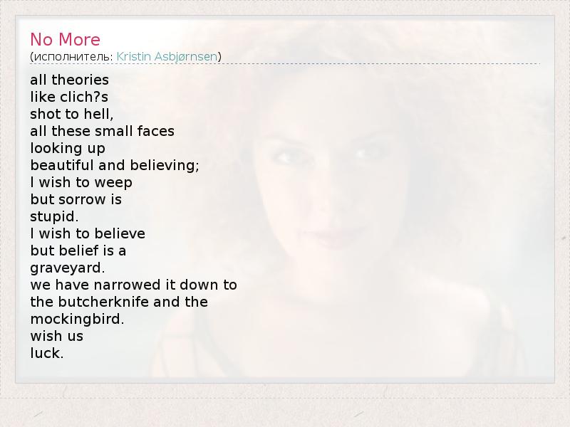 all theories like clich?s shot to hell, all these small faces looking up beautiful and believing; I wish to weep but sorrow is stupid. I wish to believe but belief is a graveyard. we have narrowed it down to the butcherknife and the mockingbird. wish us luck.