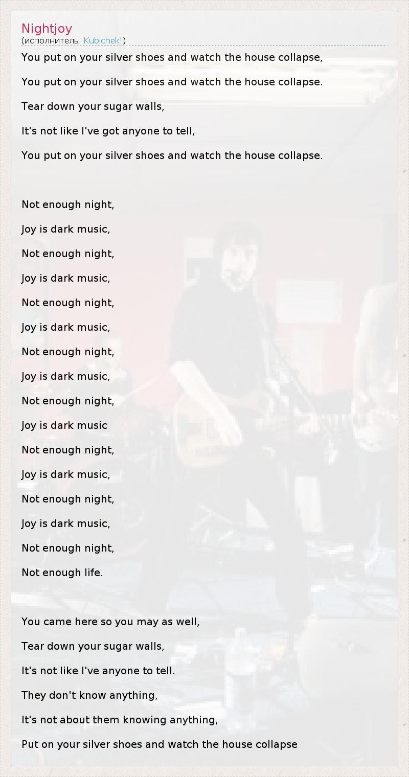 You put on your silver shoes and watch the house collapse, You put on your silver shoes and watch the house collapse. Tear down your sugar walls, It's not like I've got anyone to tell, You put on your silver shoes and watch the house collapse. Not enough night, Joy is dark music, Not enough night, Joy is dark music, Not enough night, Joy is dark music, Not enough night, Joy is dark music, Not enough night, Joy is dark music Not enough night, Joy is dark music, Not enough night, Joy is dark music, Not enough night, Not enough life. You came here so you may as well, Tear down your sugar walls, It's not like I've anyone to tell. They don't know anything, It's not about them knowing anything, Put on your silver shoes and watch the house collapse