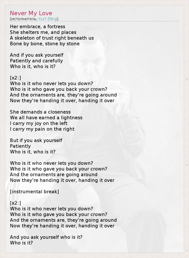 Её объятия, как крепость, Она защитила меня и приютила. Остов доверия прямо под нами - Косточка к косточке, камень к камню. А спрашиваешь ли ты себя Терпеливо и осторожно, Кто это? Кто это? [x2:] Кто тот человек, что не даёт тебе упасть? Кто тот человек, что вернул тебе корону? Орнаменты, они пляшут по кругу, А вот они меняют направление. Она требует близости, Мы все заслужили немного весёлое настроение. Я несу свою радость слева, А свою боль - справа. Но спрашиваешь ли ты себя Терпеливо, Кто это? Кто это? Кто тот человек, что не даёт тебе упасть? Кто тот человек, что вернул тебе корону? Орнаменты, они пляшут по кругу, А вот они меняют направление. [Инструментал] [x2:] Кто тот человек, что не даёт тебе упасть? Кто тот человек, что вернул тебе корону? Орнаменты, они пляшут по кругу, А вот они меняют направление. Спроси себя, кто это? Кто это?