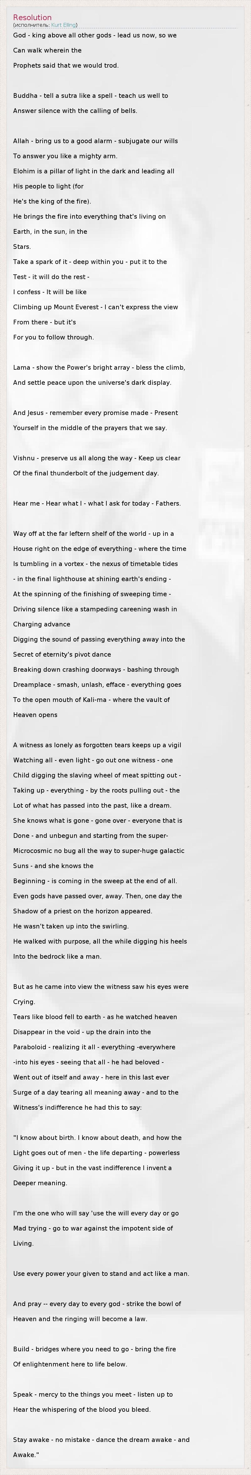 God - king above all other gods - lead us now, so we Can walk wherein the Prophets said that we would trod. Buddha - tell a sutra like a spell - teach us well to Answer silence with the calling of bells. Allah - bring us to a good alarm - subjugate our wills To answer you like a mighty arm. Elohim is a pillar of light in the dark and leading all His people to light (for He's the king of the fire). He brings the fire into everything that's living on Earth, in the sun, in the Stars. Take a spark of it - deep within you - put it to the Test - it will do the rest - I confess - It will be like Climbing up Mount Everest - I can't express the view From there - but it's For you to follow through. Lama - show the Power's bright array - bless the climb, And settle peace upon the universe's dark display. And Jesus - remember every promise made - Present Yourself in the middle of the prayers that we say. Vishnu - preserve us all along the way - Keep us clear Of the final thunderbolt of the judgement day. Hear me - Hear what I - what I ask for today - Fathers. Way off at the far leftern shelf of the world - up in a House right on the edge of everything - where the time Is tumbling in a vortex - the nexus of timetable tides - in the final lighthouse at shining earth's ending - At the spinning of the finishing of sweeping time - Driving silence like a stampeding careening wash in Charging advance Digging the sound of passing everything away into the Secret of eternity's pivot dance Breaking down crashing doorways - bashing through Dreamplace - smash, unlash, efface - everything goes To the open mouth of Kali-ma - where the vault of Heaven opens A witness as lonely as forgotten tears keeps up a vigil Watching all - even light - go out one witness - one Child digging the slaving wheel of meat spitting out - Taking up - everything - by the roots pulling out - the Lot of what has passed into the past, like a dream. She knows what is gone - gone over - everyone that is Done - and unbegun and starting from the super- Microcosmic no bug all the way to super-huge galactic Suns - and she knows the Beginning - is coming in the sweep at the end of all. Even gods have passed over, away. Then, one day the Shadow of a priest on the horizon appeared. He wasn't taken up into the swirling. He walked with purpose, all the while digging his heels Into the bedrock like a man. But as he came into view the witness saw his eyes were Crying. Tears like blood fell to earth - as he watched heaven Disappear in the void - up the drain into the Paraboloid - realizing it all - everything -everywhere -into his eyes - seeing that all - he had beloved - Went out of itself and away - here in this last ever Surge of a day tearing all meaning away - and to the Witness's indifference he had this to say: "I know about birth. I know about death, and how the Light goes out of men - the life departing - powerless Giving it up - but in the vast indifference I invent a Deeper meaning. I'm the one who will say 'use the will every day or go Mad trying - go to war against the impotent side of Living. Use every power your given to stand and act like a man. And pray -- every day to every god - strike the bowl of Heaven and the ringing will become a law. Build - bridges where you need to go - bring the fire Of enlightenment here to life below. Speak - mercy to the things you meet - listen up to Hear the whispering of the blood you bleed. Stay awake - no mistake - dance the dream awake - and Awake."