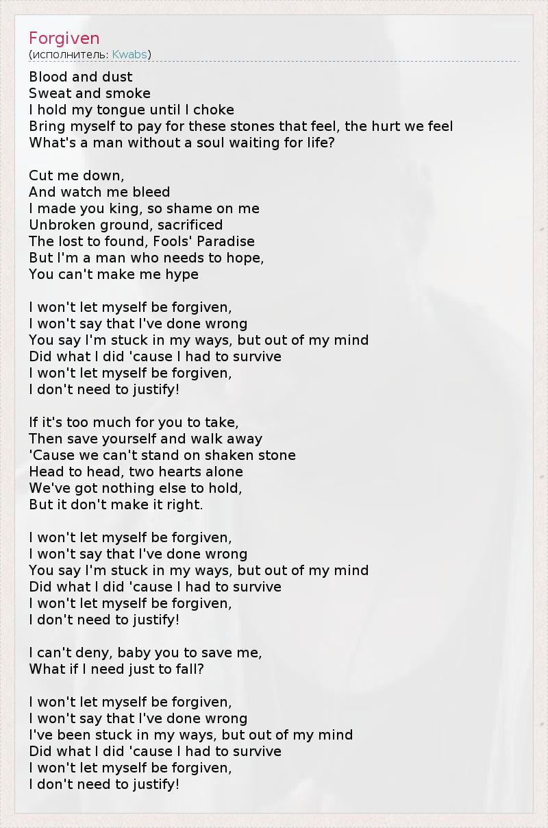 Кровь и грязь, Пот и дым, Я держал язык за зубами, пока молчание не стало меня душить. Я заставил заплатить за тяжёлые камни, за пережитую нами боль. Человек – не человек без души, которая жаждет жить. Срази меня, Взгляни, как я истекаю кровью. Я сделал тебя королём – позор же мне! Непокорённая земля принесла жертвы, Потеряла одно, чтобы обрести другое, мы живём в мире иллюзий, Но мне нужна надежда, Тебе не обмануть меня. Я не желаю быть прощённым, Я не признаю, что я неправ. Говори, что я стою на своём, потеряв рассудок, Я сделал, что сделано, потому что должен был выживать. Я не желаю быть прощённым, Я не собираюсь оправдываться! Если для тебя это слишком, Побереги себя и уйди с моего пути, Ведь нельзя стоять на треснувшей скале Вровень, мы два одиноких сердца. Мы лишились всего, Но это ничего не исправит. Я не желаю быть прощённым, Я не признаю, что я неправ. Говори, что я стою на своём, потеряв рассудок, Я сделал, что сделано, потому что должен был выживать. Я не желаю быть прощённым, Я не собираюсь оправдываться! Не могу отрицать: я спасён тобой. Но что если я создан для того, чтобы сорваться в пропасть? Я не желаю быть прощённым, Я не признаю, что я неправ. Говори, что я стою на своём, потеряв рассудок, Я сделал, что сделано, потому что должен был выживать. Я не желаю быть прощённым, Я не собираюсь оправдываться!