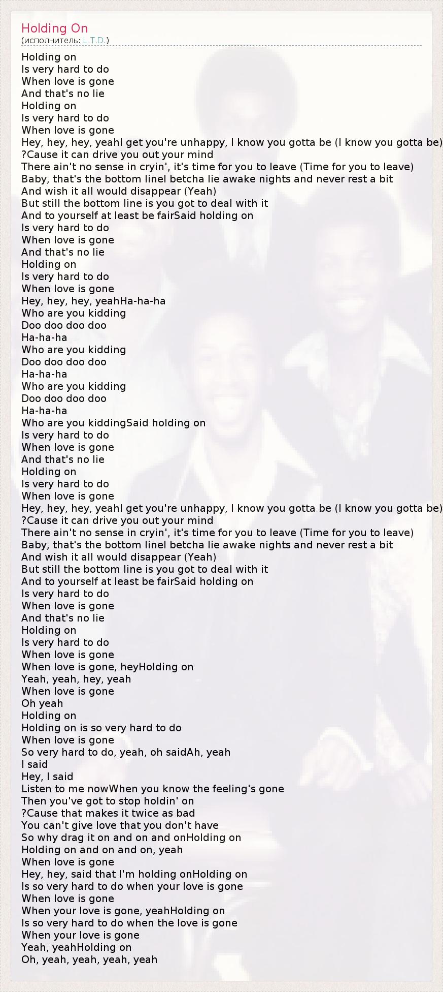 Holding on Is very hard to do When love is gone And that's no lie Holding on Is very hard to do When love is gone Hey, hey, hey, yeahI get you're unhappy, I know you gotta be (I know you gotta be) ?Cause it can drive you out your mind There ain't no sense in cryin', it's time for you to leave (Time for you to leave) Baby, that's the bottom lineI betcha lie awake nights and never rest a bit And wish it all would disappear (Yeah) But still the bottom line is you got to deal with it And to yourself at least be fairSaid holding on Is very hard to do When love is gone And that's no lie Holding on Is very hard to do When love is gone Hey, hey, hey, yeahHa-ha-ha Who are you kidding Doo doo doo doo Ha-ha-ha Who are you kidding Doo doo doo doo Ha-ha-ha Who are you kidding Doo doo doo doo Ha-ha-ha Who are you kiddingSaid holding on Is very hard to do When love is gone And that's no lie Holding on Is very hard to do When love is gone Hey, hey, hey, yeahI get you're unhappy, I know you gotta be (I know you gotta be) ?Cause it can drive you out your mind There ain't no sense in cryin', it's time for you to leave (Time for you to leave) Baby, that's the bottom lineI betcha lie awake nights and never rest a bit And wish it all would disappear (Yeah) But still the bottom line is you got to deal with it And to yourself at least be fairSaid holding on Is very hard to do When love is gone And that's no lie Holding on Is very hard to do When love is gone When love is gone, heyHolding on Yeah, yeah, hey, yeah When love is gone Oh yeah Holding on Holding on is so very hard to do When love is gone So very hard to do, yeah, oh saidAh, yeah I said Hey, I said Listen to me nowWhen you know the feeling's gone Then you've got to stop holdin' on ?Cause that makes it twice as bad You can't give love that you don't have So why drag it on and on and onHolding on Holding on and on and on, yeah When love is gone Hey, hey, said that I'm holding onHolding on Is so very hard to do when your love is gone When love is gone When your love is gone, yeahHolding on Is so very hard to do when the love is gone When your love is gone Yeah, yeahHolding on Oh, yeah, yeah, yeah, yeah