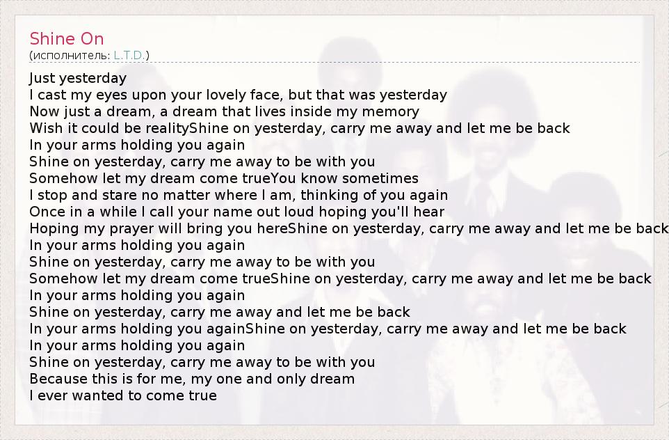 Just yesterday I cast my eyes upon your lovely face, but that was yesterday Now just a dream, a dream that lives inside my memory Wish it could be realityShine on yesterday, carry me away and let me be back In your arms holding you again Shine on yesterday, carry me away to be with you Somehow let my dream come trueYou know sometimes I stop and stare no matter where I am, thinking of you again Once in a while I call your name out loud hoping you'll hear Hoping my prayer will bring you hereShine on yesterday, carry me away and let me be back In your arms holding you again Shine on yesterday, carry me away to be with you Somehow let my dream come trueShine on yesterday, carry me away and let me be back In your arms holding you again Shine on yesterday, carry me away and let me be back In your arms holding you againShine on yesterday, carry me away and let me be back In your arms holding you again Shine on yesterday, carry me away to be with you Because this is for me, my one and only dream I ever wanted to come true