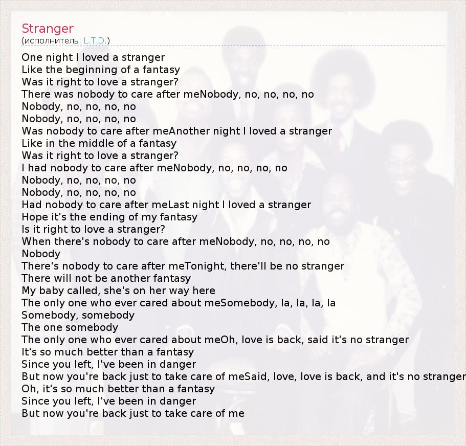 One night I loved a stranger Like the beginning of a fantasy Was it right to love a stranger? There was nobody to care after meNobody, no, no, no, no Nobody, no, no, no, no Nobody, no, no, no, no Was nobody to care after meAnother night I loved a stranger Like in the middle of a fantasy Was it right to love a stranger? I had nobody to care after meNobody, no, no, no, no Nobody, no, no, no, no Nobody, no, no, no, no Had nobody to care after meLast night I loved a stranger Hope it's the ending of my fantasy Is it right to love a stranger? When there's nobody to care after meNobody, no, no, no, no Nobody There's nobody to care after meTonight, there'll be no stranger There will not be another fantasy My baby called, she's on her way here The only one who ever cared about meSomebody, la, la, la, la Somebody, somebody The one somebody The only one who ever cared about meOh, love is back, said it's no stranger It's so much better than a fantasy Since you left, I've been in danger But now you're back just to take care of meSaid, love, love is back, and it's no stranger Oh, it's so much better than a fantasy Since you left, I've been in danger But now you're back just to take care of me