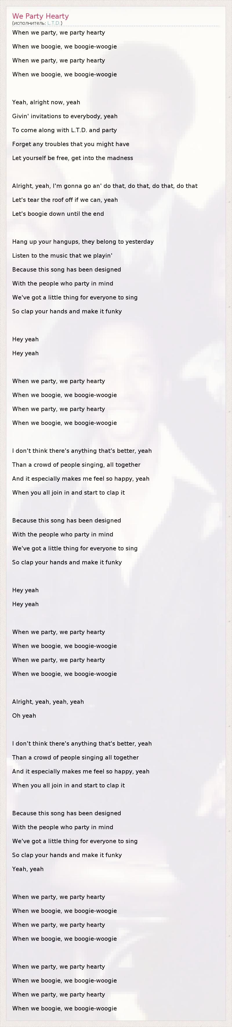 When we party, we party hearty When we boogie, we boogie-woogie When we party, we party hearty When we boogie, we boogie-woogie Yeah, alright now, yeah Givin' invitations to everybody, yeah To come along with L.T.D. and party Forget any troubles that you might have Let yourself be free, get into the madness Alright, yeah, I'm gonna go an' do that, do that, do that, do that Let's tear the roof off if we can, yeah Let's boogie down until the end Hang up your hangups, they belong to yesterday Listen to the music that we playin' Because this song has been designed With the people who party in mind We've got a little thing for everyone to sing So clap your hands and make it funky Hey yeah Hey yeah When we party, we party hearty When we boogie, we boogie-woogie When we party, we party hearty When we boogie, we boogie-woogie I don't think there's anything that's better, yeah Than a crowd of people singing, all together And it especially makes me feel so happy, yeah When you all join in and start to clap it Because this song has been designed With the people who party in mind We've got a little thing for everyone to sing So clap your hands and make it funky Hey yeah Hey yeah When we party, we party hearty When we boogie, we boogie-woogie When we party, we party hearty When we boogie, we boogie-woogie Alright, yeah, yeah, yeah Oh yeah I don't think there's anything that's better, yeah Than a crowd of people singing all together And it especially makes me feel so happy, yeah When you all join in and start to clap it Because this song has been designed With the people who party in mind We've got a little thing for everyone to sing So clap your hands and make it funky Yeah, yeah When we party, we party hearty When we boogie, we boogie-woogie When we party, we party hearty When we boogie, we boogie-woogie When we party, we party hearty When we boogie, we boogie-woogie When we party, we party hearty When we boogie, we boogie-woogie