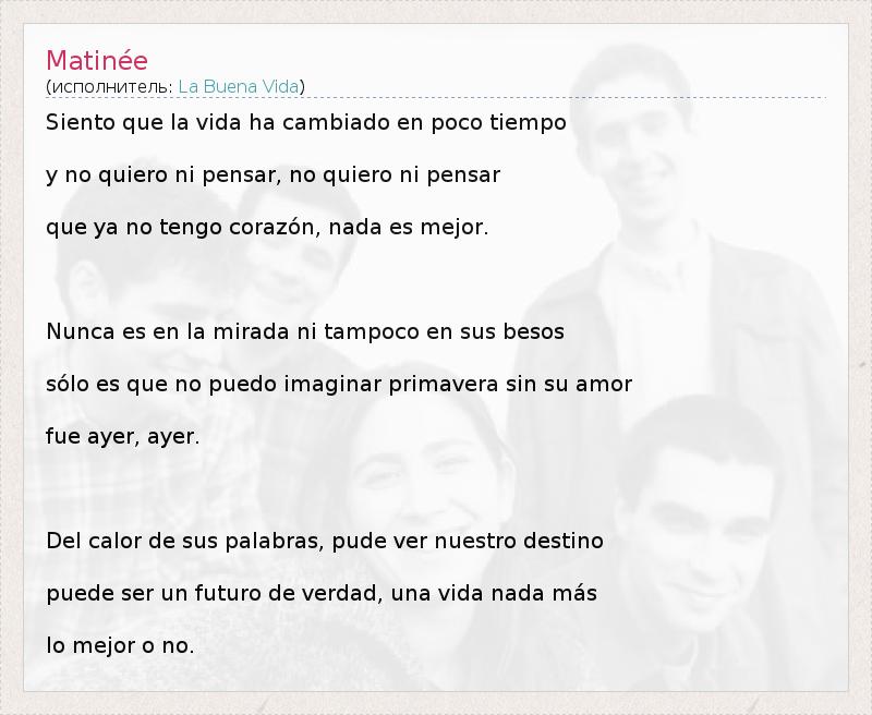 Siento que la vida ha cambiado en poco tiempo y no quiero ni pensar, no quiero ni pensar que ya no tengo corazón, nada es mejor. Nunca es en la mirada ni tampoco en sus besos sólo es que no puedo imaginar primavera sin su amor fue ayer, ayer. Del calor de sus palabras, pude ver nuestro destino puede ser un futuro de verdad, una vida nada más lo mejor o no.