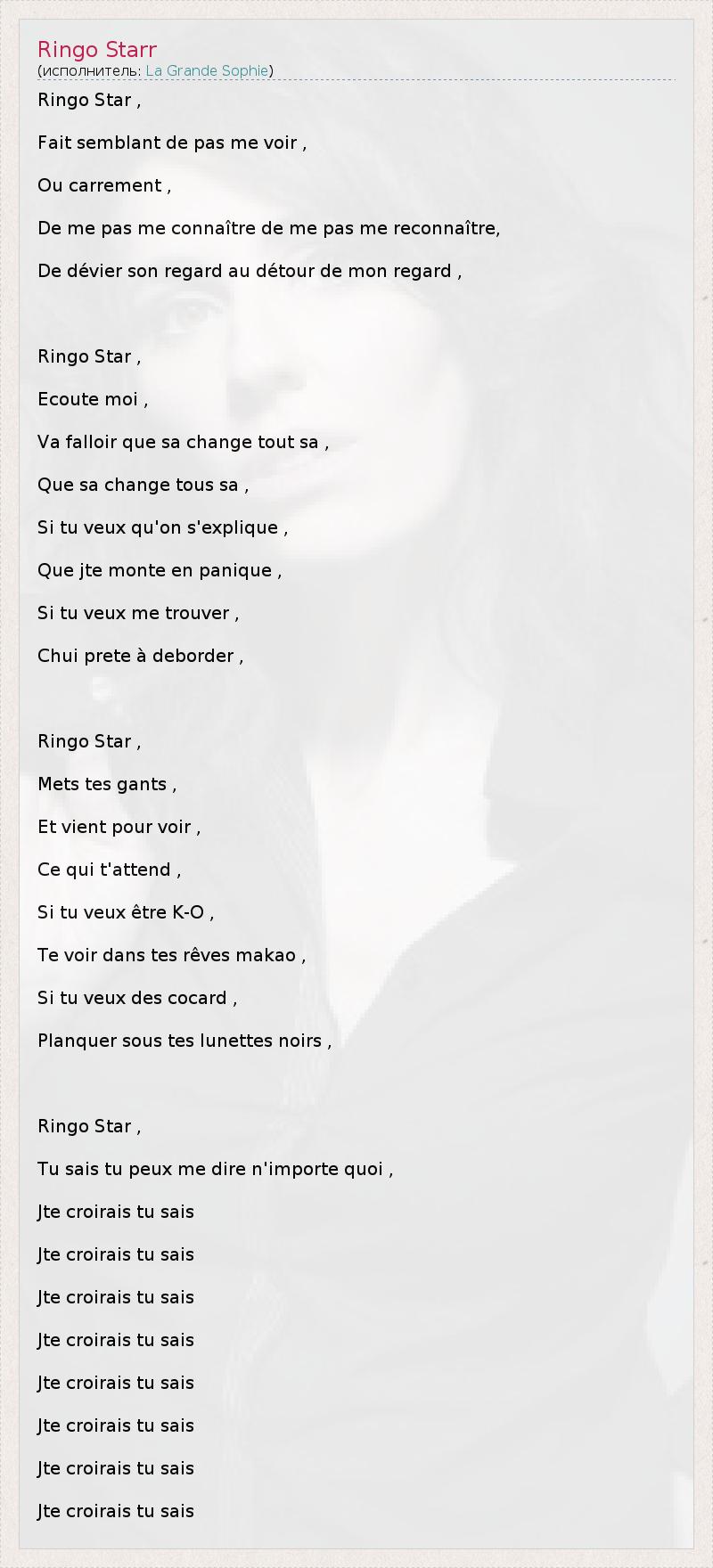Ringo Star , Fait semblant de pas me voir , Ou carrement , De me pas me connaître de me pas me reconnaître, De dévier son regard au détour de mon regard , Ringo Star , Ecoute moi , Va falloir que sa change tout sa , Que sa change tous sa , Si tu veux qu'on s'explique , Que jte monte en panique , Si tu veux me trouver , Chui prete à deborder , Ringo Star , Mets tes gants , Et vient pour voir , Ce qui t'attend , Si tu veux être K-O , Te voir dans tes rêves makao , Si tu veux des cocard , Planquer sous tes lunettes noirs , Ringo Star , Tu sais tu peux me dire n'importe quoi , Jte croirais tu sais Jte croirais tu sais Jte croirais tu sais Jte croirais tu sais Jte croirais tu sais Jte croirais tu sais Jte croirais tu sais Jte croirais tu sais