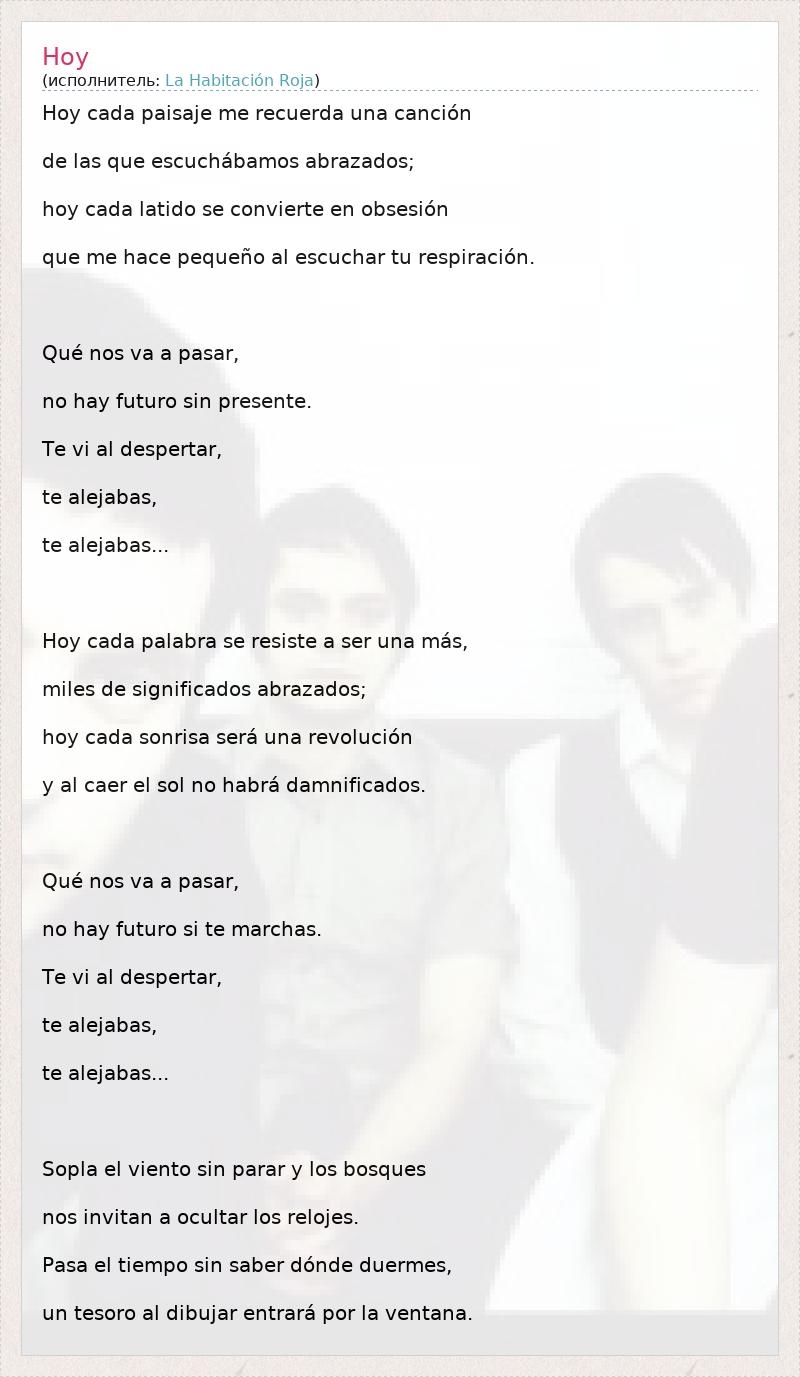 Hoy cada paisaje me recuerda una canción de las que escuchábamos abrazados; hoy cada latido se convierte en obsesión que me hace pequeño al escuchar tu respiración. Qué nos va a pasar, no hay futuro sin presente. Te vi al despertar, te alejabas, te alejabas... Hoy cada palabra se resiste a ser una más, miles de significados abrazados; hoy cada sonrisa será una revolución y al caer el sol no habrá damnificados. Qué nos va a pasar, no hay futuro si te marchas. Te vi al despertar, te alejabas, te alejabas... Sopla el viento sin parar y los bosques nos invitan a ocultar los relojes. Pasa el tiempo sin saber dónde duermes, un tesoro al dibujar entrará por la ventana.