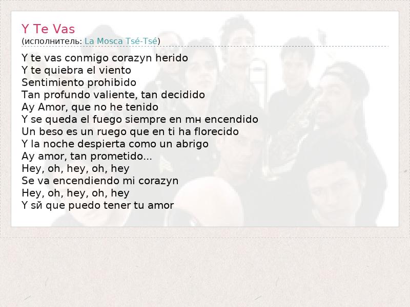 Y te vas conmigo corazуn herido Y te quiebra el viento Sentimiento prohibido Tan profundo valiente, tan decidido Ay Amor, que no he tenido Y se queda el fuego siempre en mн encendido Un beso es un ruego que en ti ha florecido Y la noche despierta como un abrigo Ay amor, tan prometido... Hey, oh, hey, oh, hey Se va encendiendo mi corazуn Hey, oh, hey, oh, hey Y sй que puedo tener tu amor