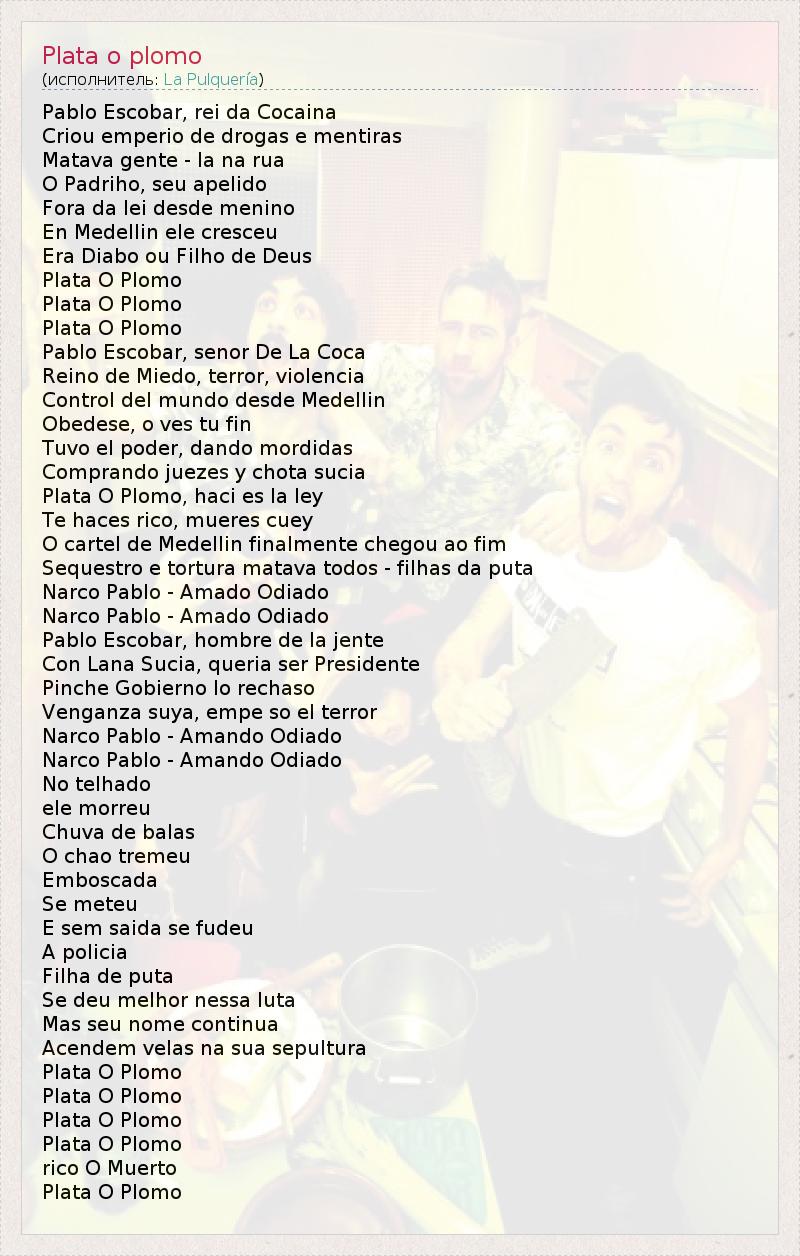 Pablo Escobar, rei da Cocaina Criou emperio de drogas e mentiras Matava gente - la na rua O Padriho, seu apelido Fora da lei desde menino En Medellin ele cresceu Era Diabo ou Filho de Deus Plata O Plomo Plata O Plomo Plata O Plomo Pablo Escobar, senor De La Coca Reino de Miedo, terror, violencia Control del mundo desde Medellin Obedese, o ves tu fin Tuvo el poder, dando mordidas Comprando juezes y chota sucia Plata O Plomo, haci es la ley Te haces rico, mueres cuey O cartel de Medellin finalmente chegou ao fim Sequestro e tortura matava todos - filhas da puta Narco Pablo - Amado Odiado Narco Pablo - Amado Odiado Pablo Escobar, hombre de la jente Con Lana Sucia, queria ser Presidente Pinche Gobierno lo rechaso Venganza suya, empe so el terror Narco Pablo - Amando Odiado Narco Pablo - Amando Odiado No telhado ele morreu Chuva de balas O chao tremeu Emboscada Se meteu E sem saida se fudeu A policia Filha de puta Se deu melhor nessa luta Mas seu nome continua Acendem velas na sua sepultura Plata O Plomo Plata O Plomo Plata O Plomo Plata O Plomo rico O Muerto Plata O Plomo