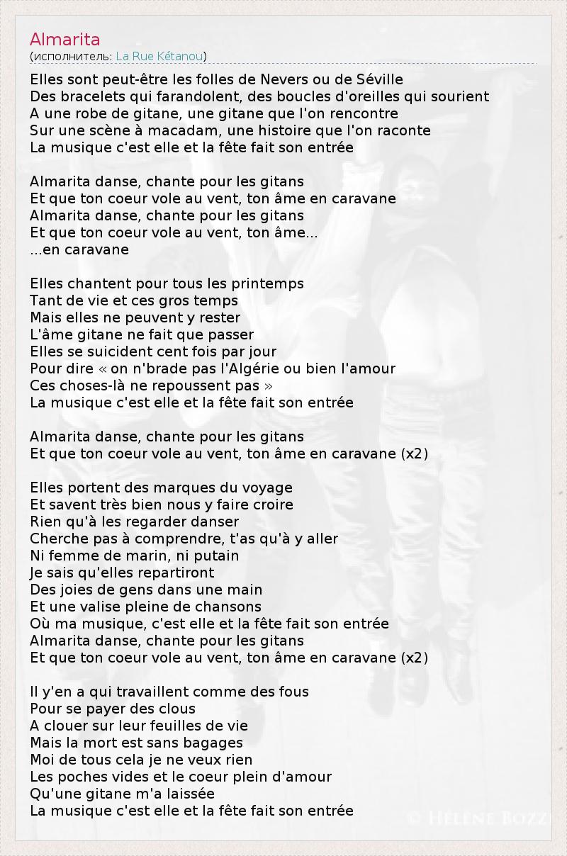 Elles sont peut-être les folles de Nevers ou de Séville Des bracelets qui farandolent, des boucles d'oreilles qui sourient A une robe de gitane, une gitane que l'on rencontre Sur une scène à macadam, une histoire que l'on raconte La musique c'est elle et la fête fait son entrée Almarita danse, chante pour les gitans Et que ton coeur vole au vent, ton âme en caravane Almarita danse, chante pour les gitans Et que ton coeur vole au vent, ton âme... ...en caravane Elles chantent pour tous les printemps Tant de vie et ces gros temps Mais elles ne peuvent y rester L'âme gitane ne fait que passer Elles se suicident cent fois par jour Pour dire « on n'brade pas l'Algérie ou bien l'amour Ces choses-là ne repoussent pas » La musique c'est elle et la fête fait son entrée Almarita danse, chante pour les gitans Et que ton coeur vole au vent, ton âme en caravane (x2) Elles portent des marques du voyage Et savent très bien nous y faire croire Rien qu'à les regarder danser Cherche pas à comprendre, t'as qu'à y aller Ni femme de marin, ni putain Je sais qu'elles repartiront Des joies de gens dans une main Et une valise pleine de chansons Où ma musique, c'est elle et la fête fait son entrée Almarita danse, chante pour les gitans Et que ton coeur vole au vent, ton âme en caravane (x2) Il y'en a qui travaillent comme des fous Pour se payer des clous A clouer sur leur feuilles de vie Mais la mort est sans bagages Moi de tous cela je ne veux rien Les poches vides et le coeur plein d'amour Qu'une gitane m'a laissée La musique c'est elle et la fête fait son entrée