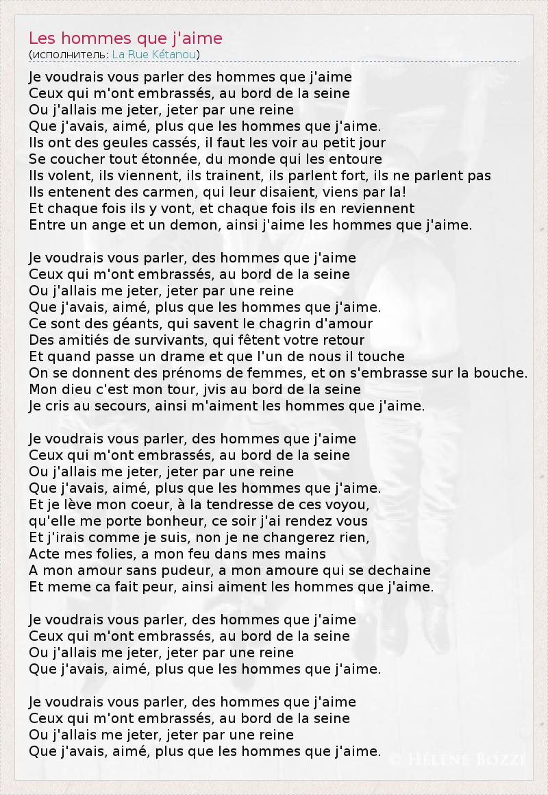 Je voudrais vous parler des hommes que j'aime Ceux qui m'ont embrassés, au bord de la seine Ou j'allais me jeter, jeter par une reine Que j'avais, aimé, plus que les hommes que j'aime. Ils ont des geules cassés, il faut les voir au petit jour Se coucher tout étonnée, du monde qui les entoure Ils volent, ils viennent, ils trainent, ils parlent fort, ils ne parlent pas Ils entenent des carmen, qui leur disaient, viens par la! Et chaque fois ils y vont, et chaque fois ils en reviennent Entre un ange et un demon, ainsi j'aime les hommes que j'aime. Je voudrais vous parler, des hommes que j'aime Ceux qui m'ont embrassés, au bord de la seine Ou j'allais me jeter, jeter par une reine Que j'avais, aimé, plus que les hommes que j'aime. Ce sont des géants, qui savent le chagrin d'amour Des amitiés de survivants, qui fêtent votre retour Et quand passe un drame et que l'un de nous il touche On se donnent des prénoms de femmes, et on s'embrasse sur la bouche. Mon dieu c'est mon tour, jvis au bord de la seine Je cris au secours, ainsi m'aiment les hommes que j'aime. Je voudrais vous parler, des hommes que j'aime Ceux qui m'ont embrassés, au bord de la seine Ou j'allais me jeter, jeter par une reine Que j'avais, aimé, plus que les hommes que j'aime. Et je lève mon coeur, à la tendresse de ces voyou, qu'elle me porte bonheur, ce soir j'ai rendez vous Et j'irais comme je suis, non je ne changerez rien, Acte mes folies, a mon feu dans mes mains A mon amour sans pudeur, a mon amoure qui se dechaine Et meme ca fait peur, ainsi aiment les hommes que j'aime. Je voudrais vous parler, des hommes que j'aime Ceux qui m'ont embrassés, au bord de la seine Ou j'allais me jeter, jeter par une reine Que j'avais, aimé, plus que les hommes que j'aime. Je voudrais vous parler, des hommes que j'aime Ceux qui m'ont embrassés, au bord de la seine Ou j'allais me jeter, jeter par une reine Que j'avais, aimé, plus que les hommes que j'aime.