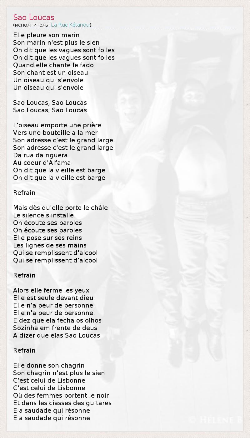 Elle pleure son marin Son marin n'est plus le sien On dit que les vagues sont folles On dit que les vagues sont folles Quand elle chante le fado Son chant est un oiseau Un oiseau qui s'envole Un oiseau qui s'envole Sao Loucas, Sao Loucas Sao Loucas, Sao Loucas L'oiseau emporte une prière Vers une bouteille a la mer Son adresse c'est le grand large Son adresse c'est le grand large Da rua da riguera Au coeur d'Alfama On dit que la vieille est barge On dit que la vieille est barge Refrain Mais dès qu'elle porte le châle Le silence s'installe On écoute ses paroles On écoute ses paroles Elle pose sur ses reins Les lignes de ses mains Qui se remplissent d'alcool Qui se remplissent d'alcool Refrain Alors elle ferme les yeux Elle est seule devant dieu Elle n'a peur de personne Elle n'a peur de personne E dez que ela fecha os olhos Sozinha em frente de deus A dizer que elas Sao Loucas Refrain Elle donne son chagrin Son chagrin n'est plus le sien C'est celui de Lisbonne C'est celui de Lisbonne Où des femmes portent le noir Et dans les ciasses des guitares E a saudade qui résonne E a saudade qui résonne