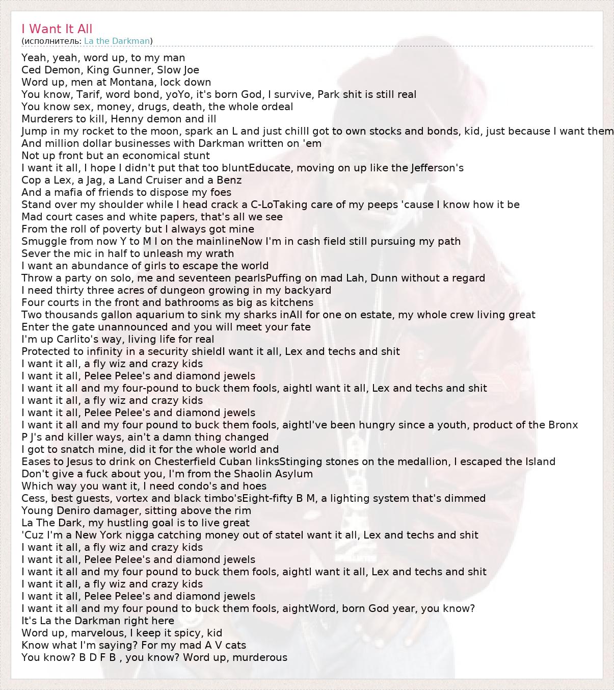 Yeah, yeah, word up, to my man Ced Demon, King Gunner, Slow Joe Word up, men at Montana, lock down You know, Tarif, word bond, yoYo, it's born God, I survive, Park shit is still real You know sex, money, drugs, death, the whole ordeal Murderers to kill, Henny demon and ill Jump in my rocket to the moon, spark an L and just chillI got to own stocks and bonds, kid, just because I want them And million dollar businesses with Darkman written on 'em Not up front but an economical stunt I want it all, I hope I didn't put that too bluntEducate, moving on up like the Jefferson's Cop a Lex, a Jag, a Land Cruiser and a Benz And a mafia of friends to dispose my foes Stand over my shoulder while I head crack a C-LoTaking care of my peeps 'cause I know how it be Mad court cases and white papers, that's all we see From the roll of poverty but I always got mine Smuggle from now Y to M I on the mainlineNow I'm in cash field still pursuing my path Sever the mic in half to unleash my wrath I want an abundance of girls to escape the world Throw a party on solo, me and seventeen pearlsPuffing on mad Lah, Dunn without a regard I need thirty three acres of dungeon growing in my backyard Four courts in the front and bathrooms as big as kitchens Two thousands gallon aquarium to sink my sharks inAll for one on estate, my whole crew living great Enter the gate unannounced and you will meet your fate I'm up Carlito's way, living life for real Protected to infinity in a security shieldI want it all, Lex and techs and shit I want it all, a fly wiz and crazy kids I want it all, Pelee Pelee's and diamond jewels I want it all and my four-pound to buck them fools, aightI want it all, Lex and techs and shit I want it all, a fly wiz and crazy kids I want it all, Pelee Pelee's and diamond jewels I want it all and my four pound to buck them fools, aightI've been hungry since a youth, product of the Bronx P J's and killer ways, ain't a damn thing changed I got to snatch mine, did it for the whole world and Eases to Jesus to drink on Chesterfield Cuban linksStinging stones on the medallion, I escaped the Island Don't give a fuck about you, I'm from the Shaolin Asylum Which way you want it, I need condo's and hoes Cess, best guests, vortex and black timbo'sEight-fifty B M, a lighting system that's dimmed Young Deniro damager, sitting above the rim La The Dark, my hustling goal is to live great 'Cuz I'm a New York nigga catching money out of stateI want it all, Lex and techs and shit I want it all, a fly wiz and crazy kids I want it all, Pelee Pelee's and diamond jewels I want it all and my four pound to buck them fools, aightI want it all, Lex and techs and shit I want it all, a fly wiz and crazy kids I want it all, Pelee Pelee's and diamond jewels I want it all and my four pound to buck them fools, aightWord, born God year, you know? It's La the Darkman right here Word up, marvelous, I keep it spicy, kid Know what I'm saying? For my mad A V cats You know? B D F B , you know? Word up, murderous