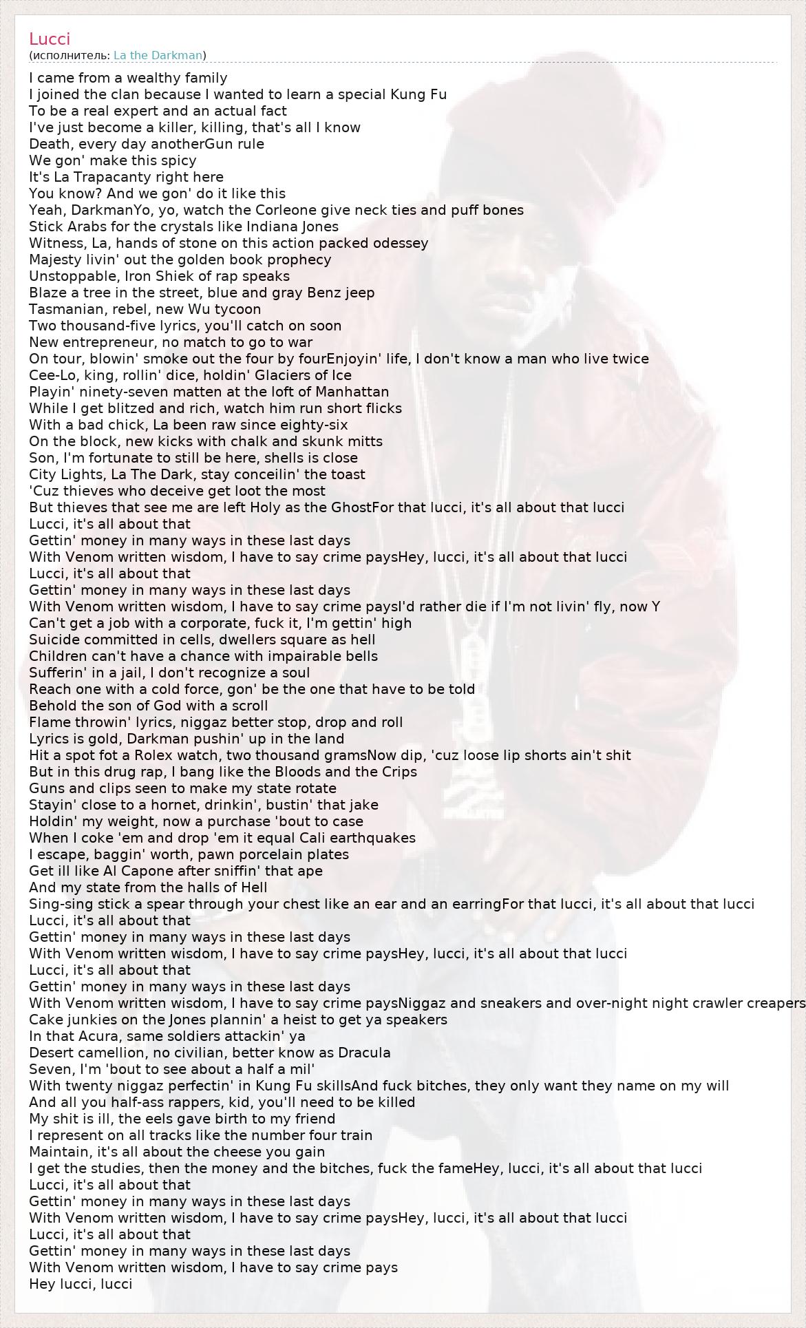 I came from a wealthy family I joined the clan because I wanted to learn a special Kung Fu To be a real expert and an actual fact I've just become a killer, killing, that's all I know Death, every day anotherGun rule We gon' make this spicy It's La Trapacanty right here You know? And we gon' do it like this Yeah, DarkmanYo, yo, watch the Corleone give neck ties and puff bones Stick Arabs for the crystals like Indiana Jones Witness, La, hands of stone on this action packed odessey Majesty livin' out the golden book prophecy Unstoppable, Iron Shiek of rap speaks Blaze a tree in the street, blue and gray Benz jeep Tasmanian, rebel, new Wu tycoon Two thousand-five lyrics, you'll catch on soon New entrepreneur, no match to go to war On tour, blowin' smoke out the four by fourEnjoyin' life, I don't know a man who live twice Cee-Lo, king, rollin' dice, holdin' Glaciers of Ice Playin' ninety-seven matten at the loft of Manhattan While I get blitzed and rich, watch him run short flicks With a bad chick, La been raw since eighty-six On the block, new kicks with chalk and skunk mitts Son, I'm fortunate to still be here, shells is close City Lights, La The Dark, stay conceilin' the toast 'Cuz thieves who deceive get loot the most But thieves that see me are left Holy as the GhostFor that lucci, it's all about that lucci Lucci, it's all about that Gettin' money in many ways in these last days With Venom written wisdom, I have to say crime paysHey, lucci, it's all about that lucci Lucci, it's all about that Gettin' money in many ways in these last days With Venom written wisdom, I have to say crime paysI'd rather die if I'm not livin' fly, now Y Can't get a job with a corporate, fuck it, I'm gettin' high Suicide committed in cells, dwellers square as hell Children can't have a chance with impairable bells Sufferin' in a jail, I don't recognize a soul Reach one with a cold force, gon' be the one that have to be told Behold the son of God with a scroll Flame throwin' lyrics, niggaz better stop, drop and roll Lyrics is gold, Darkman pushin' up in the land Hit a spot fot a Rolex watch, two thousand gramsNow dip, 'cuz loose lip shorts ain't shit But in this drug rap, I bang like the Bloods and the Crips Guns and clips seen to make my state rotate Stayin' close to a hornet, drinkin', bustin' that jake Holdin' my weight, now a purchase 'bout to case When I coke 'em and drop 'em it equal Cali earthquakes I escape, baggin' worth, pawn porcelain plates Get ill like Al Capone after sniffin' that ape And my state from the halls of Hell Sing-sing stick a spear through your chest like an ear and an earringFor that lucci, it's all about that lucci Lucci, it's all about that Gettin' money in many ways in these last days With Venom written wisdom, I have to say crime paysHey, lucci, it's all about that lucci Lucci, it's all about that Gettin' money in many ways in these last days With Venom written wisdom, I have to say crime paysNiggaz and sneakers and over-night night crawler creapers Cake junkies on the Jones plannin' a heist to get ya speakers In that Acura, same soldiers attackin' ya Desert camellion, no civilian, better know as Dracula Seven, I'm 'bout to see about a half a mil' With twenty niggaz perfectin' in Kung Fu skillsAnd fuck bitches, they only want they name on my will And all you half-ass rappers, kid, you'll need to be killed My shit is ill, the eels gave birth to my friend I represent on all tracks like the number four train Maintain, it's all about the cheese you gain I get the studies, then the money and the bitches, fuck the fameHey, lucci, it's all about that lucci Lucci, it's all about that Gettin' money in many ways in these last days With Venom written wisdom, I have to say crime paysHey, lucci, it's all about that lucci Lucci, it's all about that Gettin' money in many ways in these last days With Venom written wisdom, I have to say crime pays Hey lucci, lucci