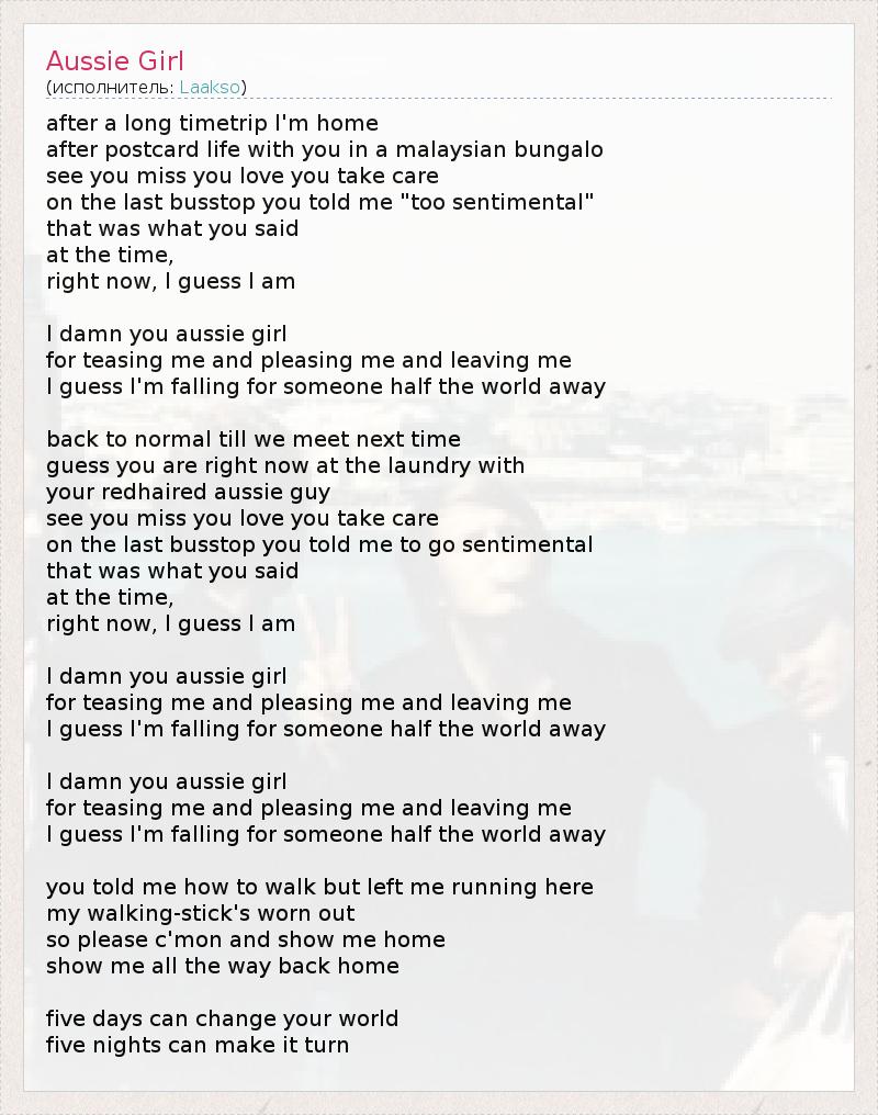 after a long timetrip I'm home after postcard life with you in a malaysian bungalo see you miss you love you take care on the last busstop you told me "too sentimental" that was what you said at the time, right now, I guess I am I damn you aussie girl for teasing me and pleasing me and leaving me I guess I'm falling for someone half the world away back to normal till we meet next time guess you are right now at the laundry with your redhaired aussie guy see you miss you love you take care on the last busstop you told me to go sentimental that was what you said at the time, right now, I guess I am I damn you aussie girl for teasing me and pleasing me and leaving me I guess I'm falling for someone half the world away I damn you aussie girl for teasing me and pleasing me and leaving me I guess I'm falling for someone half the world away you told me how to walk but left me running here my walking-stick's worn out so please c'mon and show me home show me all the way back home five days can change your world five nights can make it turn