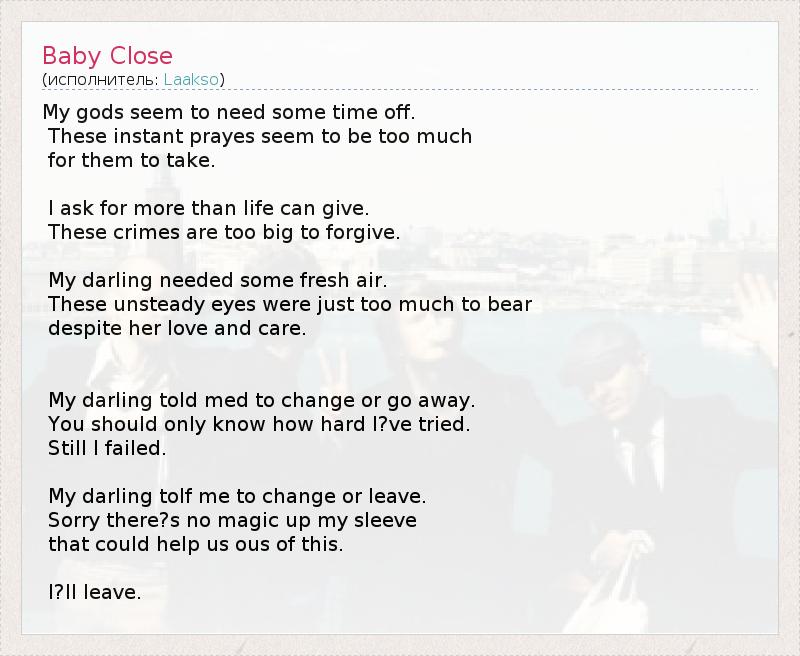 My gods seem to need some time off. These instant prayes seem to be too much for them to take. I ask for more than life can give. These crimes are too big to forgive. My darling needed some fresh air. These unsteady eyes were just too much to bear despite her love and care. My darling told med to change or go away. You should only know how hard I?ve tried. Still I failed. My darling tolf me to change or leave. Sorry there?s no magic up my sleeve that could help us ous of this. I?ll leave.