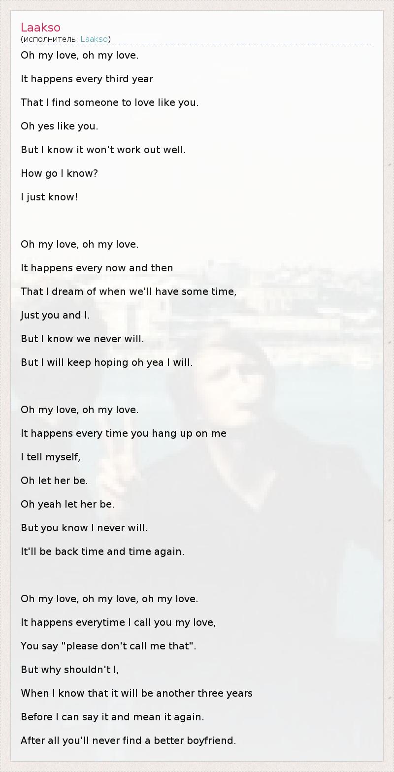 Oh my love, oh my love. It happens every third year That I find someone to love like you. Oh yes like you. But I know it won't work out well. How go I know? I just know! Oh my love, oh my love. It happens every now and then That I dream of when we'll have some time, Just you and I. But I know we never will. But I will keep hoping oh yea I will. Oh my love, oh my love. It happens every time you hang up on me I tell myself, Oh let her be. Oh yeah let her be. But you know I never will. It'll be back time and time again. Oh my love, oh my love, oh my love. It happens everytime I call you my love, You say "please don't call me that". But why shouldn't I, When I know that it will be another three years Before I can say it and mean it again. After all you'll never find a better boyfriend.