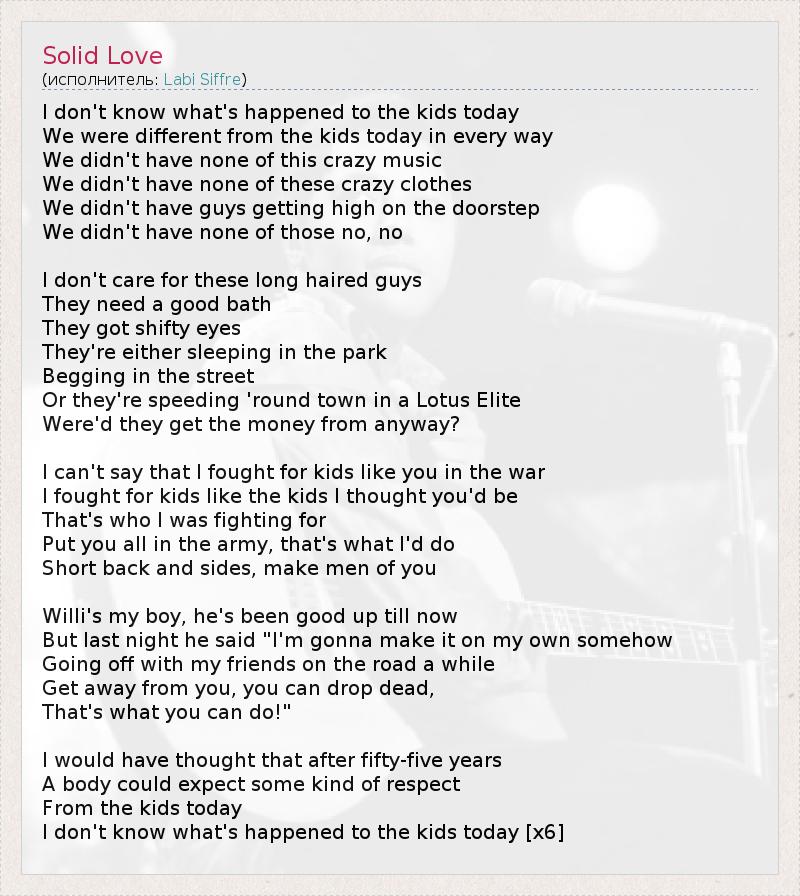 I don't know what's happened to the kids today We were different from the kids today in every way We didn't have none of this crazy music We didn't have none of these crazy clothes We didn't have guys getting high on the doorstep We didn't have none of those no, no I don't care for these long haired guys They need a good bath They got shifty eyes They're either sleeping in the park Begging in the street Or they're speeding 'round town in a Lotus Elite Were'd they get the money from anyway? I can't say that I fought for kids like you in the war I fought for kids like the kids I thought you'd be That's who I was fighting for Put you all in the army, that's what I'd do Short back and sides, make men of you Willi's my boy, he's been good up till now But last night he said "I'm gonna make it on my own somehow Going off with my friends on the road a while Get away from you, you can drop dead, That's what you can do!" I would have thought that after fifty-five years A body could expect some kind of respect From the kids today I don't know what's happened to the kids today [x6]