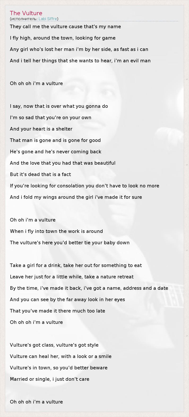 They call me the vulture cause that's my name I fly high, around the town, looking for game Any girl who's lost her man i'm by her side, as fast as i can And i tell her things that she wants to hear, i'm an evil man Oh oh oh i'm a vulture I say, now that is over what you gonna do I'm so sad that you're on your own And your heart is a shelter That man is gone and is gone for good He's gone and he's never coming back And the love that you had that was beautiful But it's dead that is a fact If you're looking for consolation you don't have to look no more And i fold my wings around the girl i've made it for sure Oh oh i'm a vulture When i fly into town the work is around The vulture's here you'd better tie your baby down Take a girl for a drink, take her out for something to eat Leave her just for a little while, take a nature retreat By the time, i've made it back, i've got a name, address and a date And you can see by the far away look in her eyes That you've made it there much too late Oh oh oh i'm a vulture Vulture's got class, vulture's got style Vulture can heal her, with a look or a smile Vulture's in town, so you'd better beware Married or single, i just don't care Oh oh oh i'm a vulture